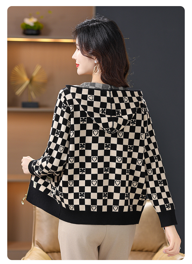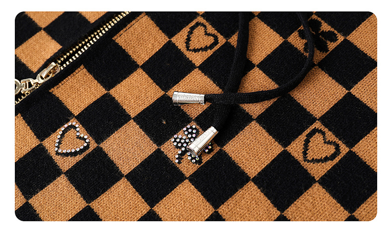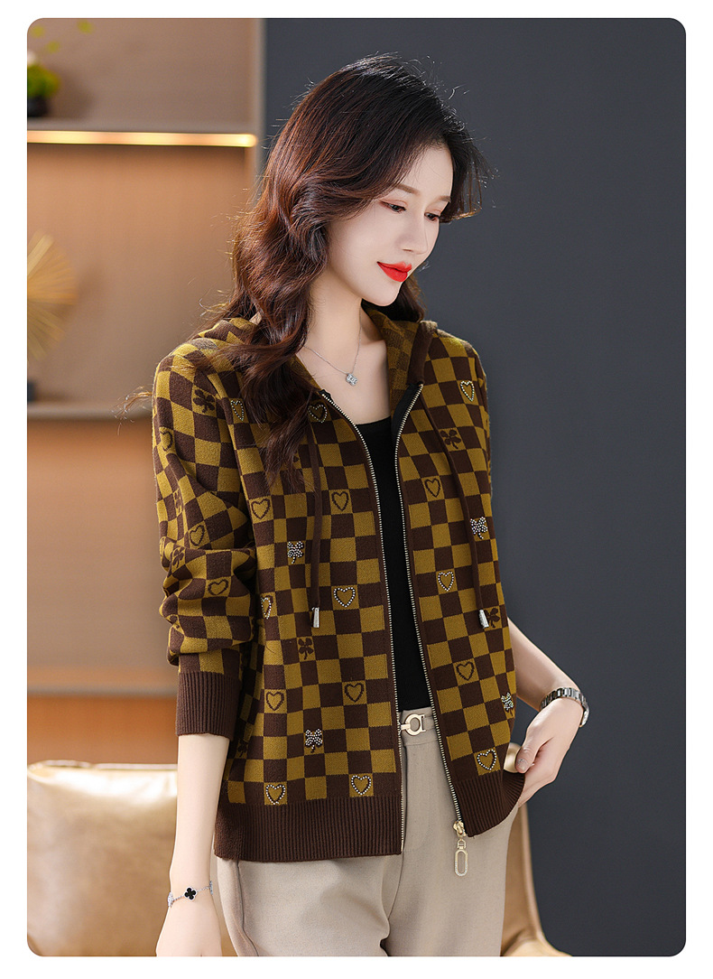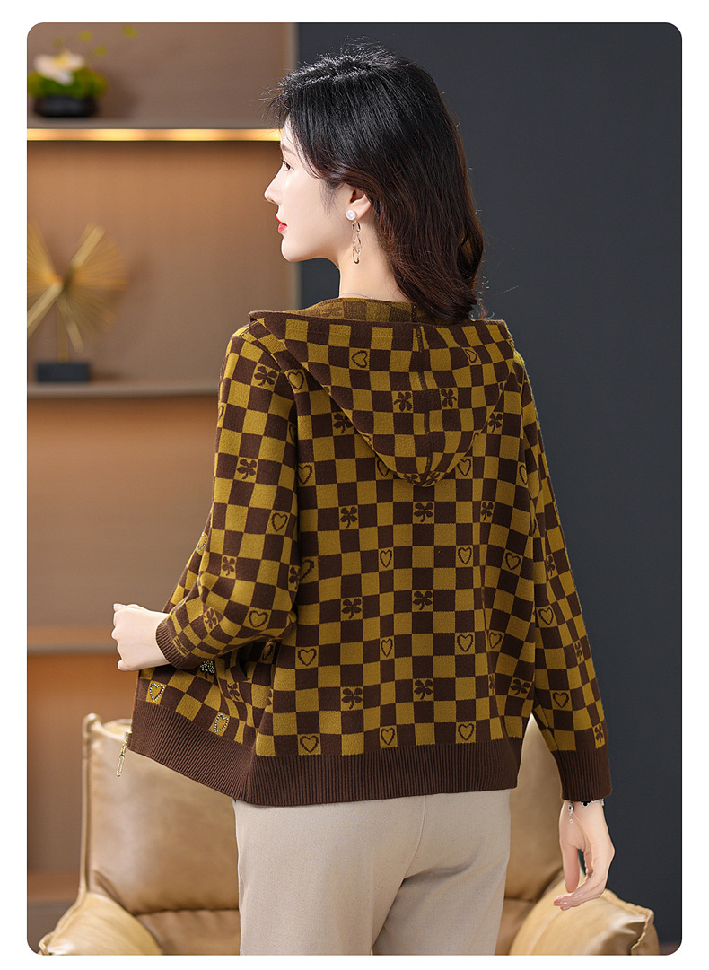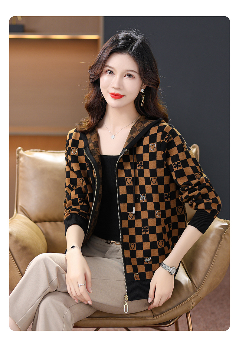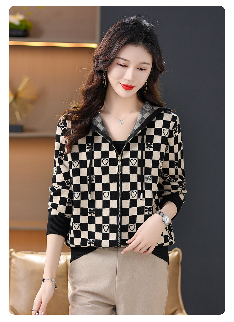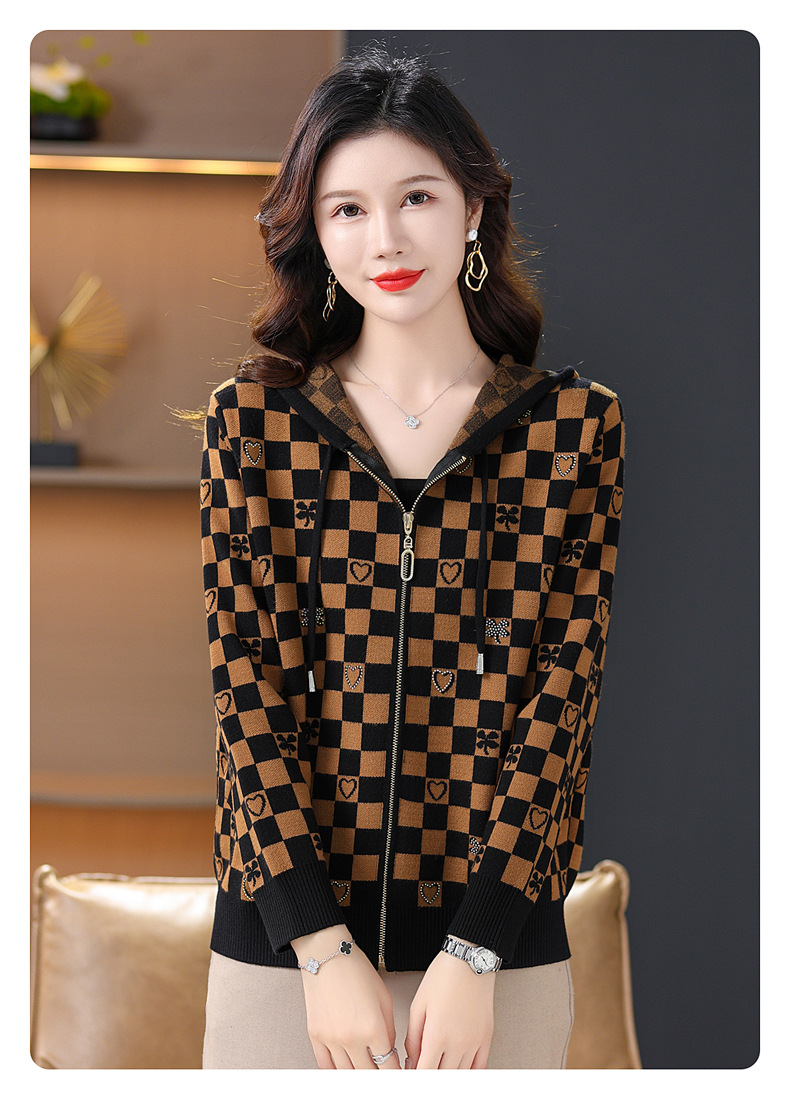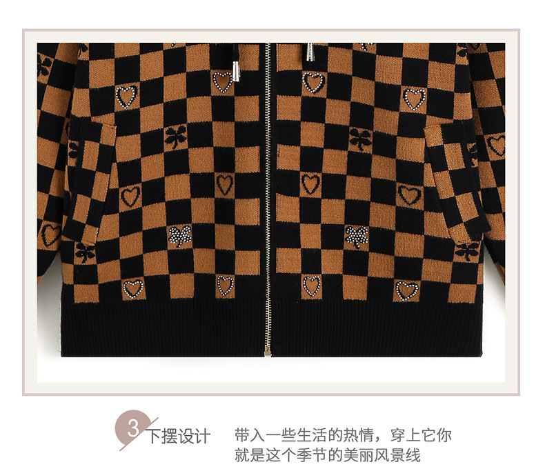 2023年新款洋气针织开衫格子连帽短外套CC-21-8106