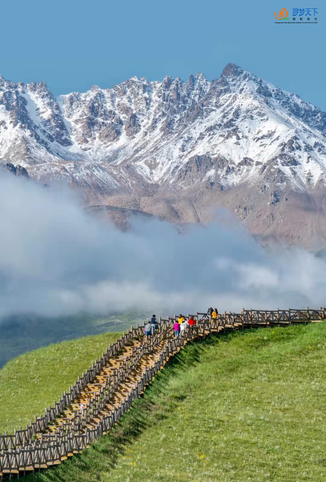 2.岗什卡:岗什卡雪峰海拔 5254.5 米,是祁连山脉东段的最高峰。可拍摄雪峰的全貌,在阳光照耀下,雪峰闪耀着银色光芒,与周边的蓝天白云、草地森林构成绝美画面。可选择在不同角度和时间段拍摄,如日出日落时分,光线为雪峰染上金色,更加壮观。