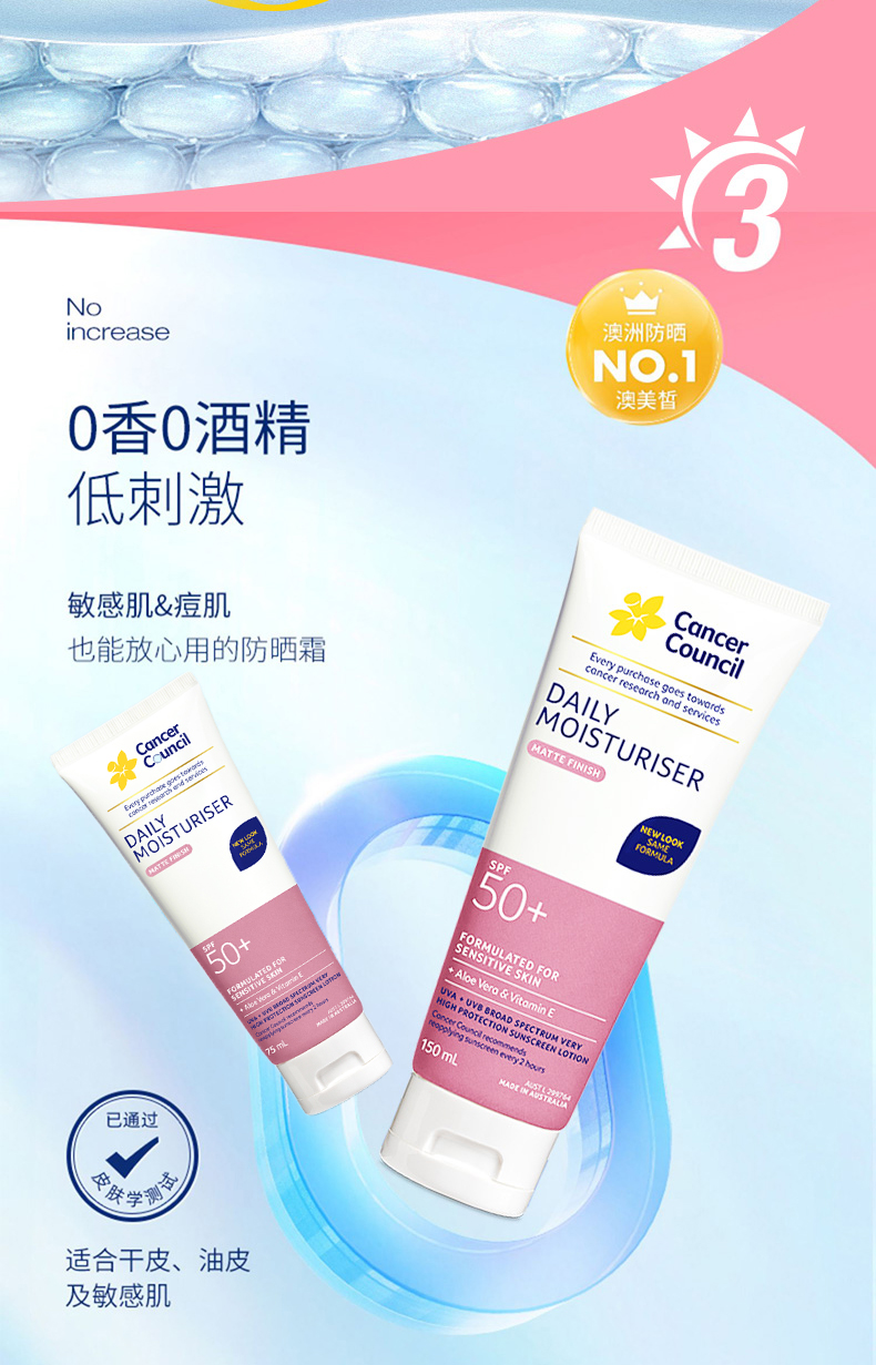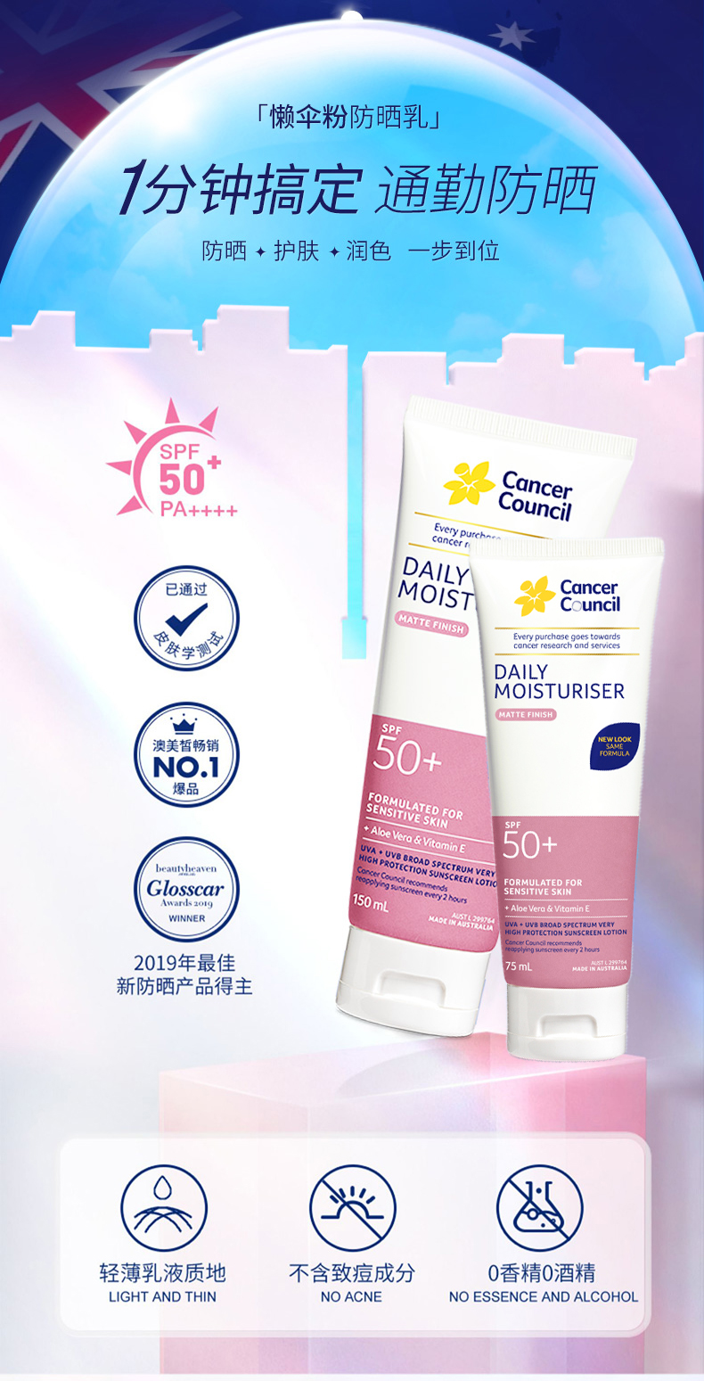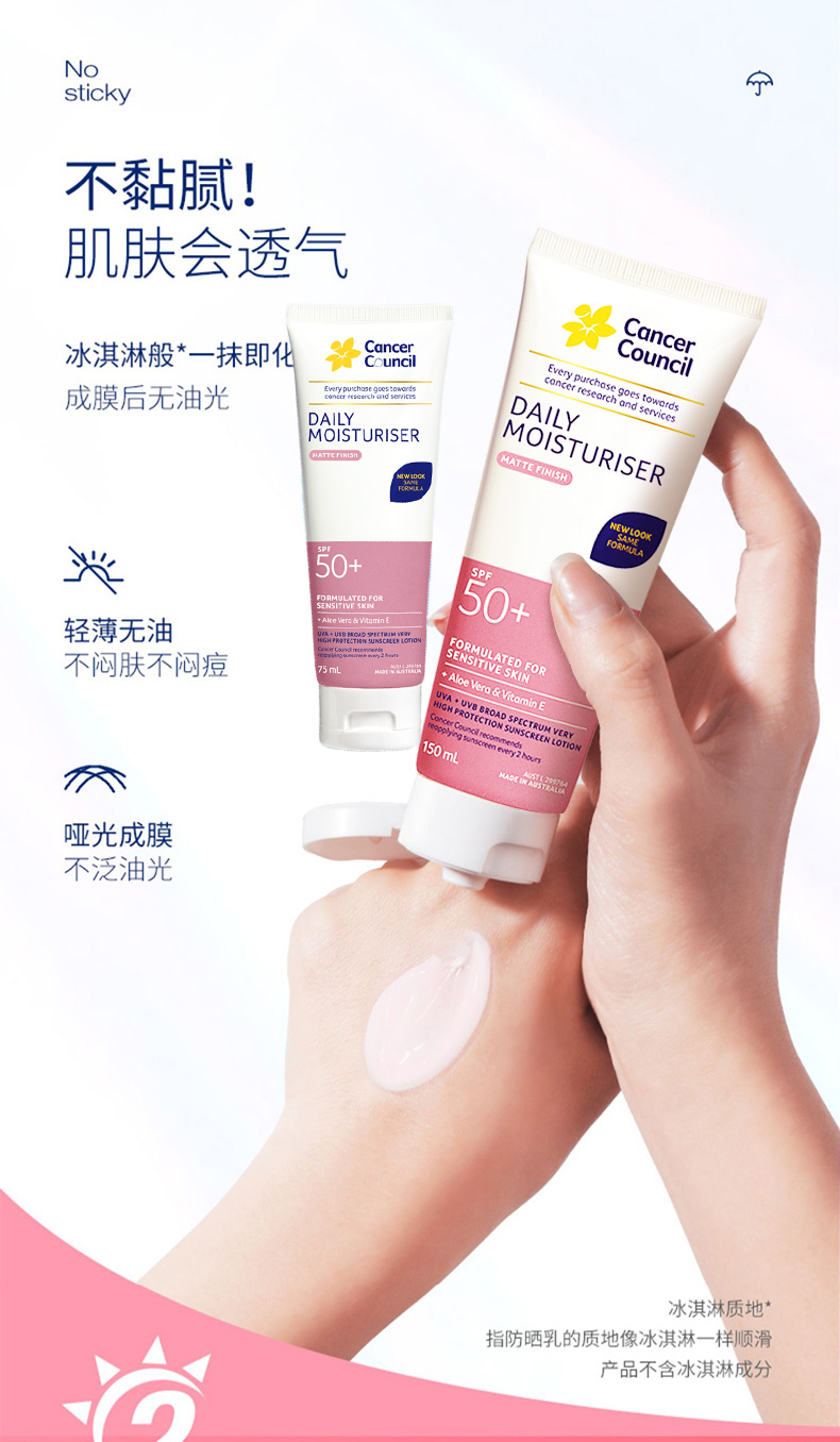 澳洲Cancer Council澳美皙日常面部身体防晒SPF50+粉色75ml 150ml