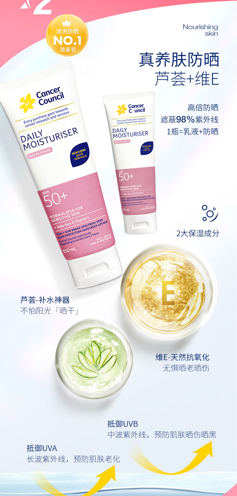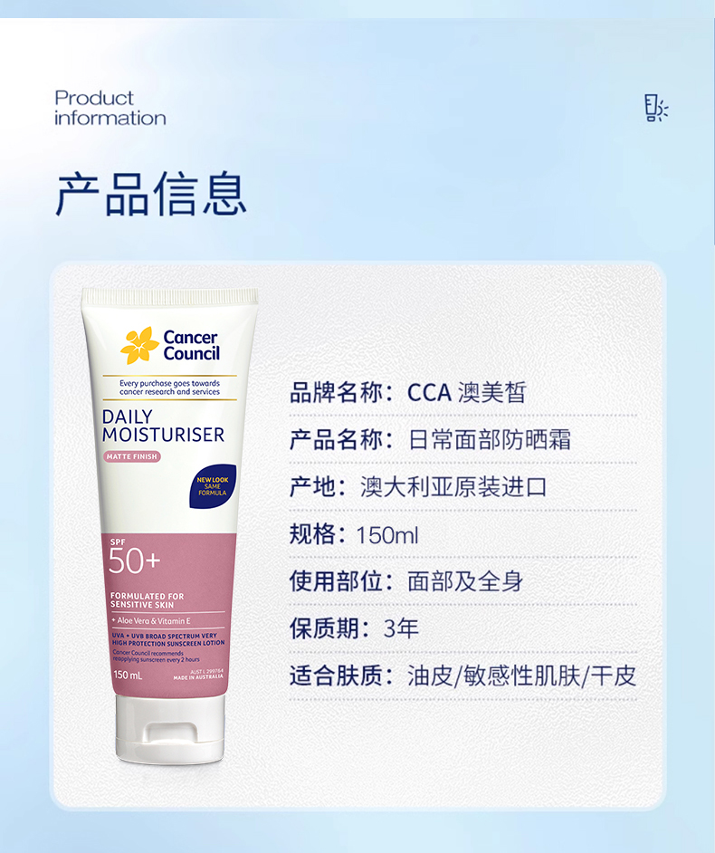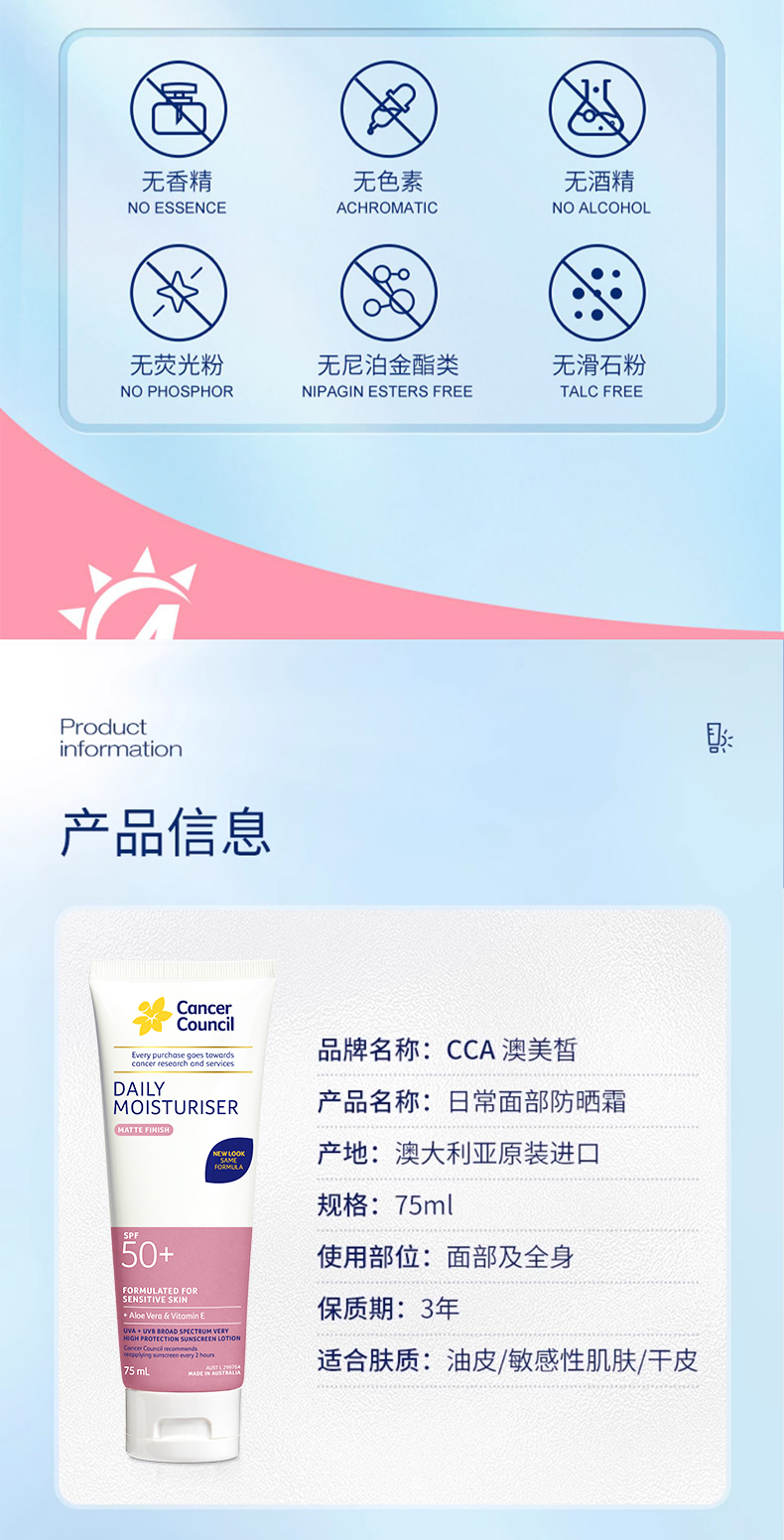 澳洲Cancer Council澳美皙日常面部身体防晒SPF50+粉色75ml 150ml