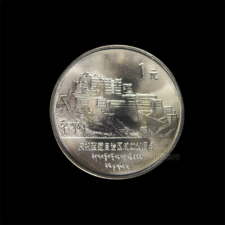 【背景图案】主景图案为西藏布达拉宫,内缘右上方刊“1元”面值,下方刊“庆祝西藏自治区成立20周年”的汉文与藏文。