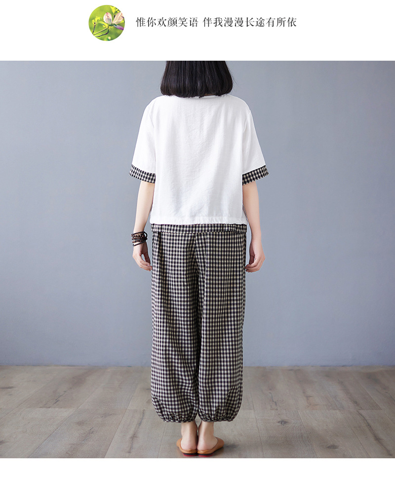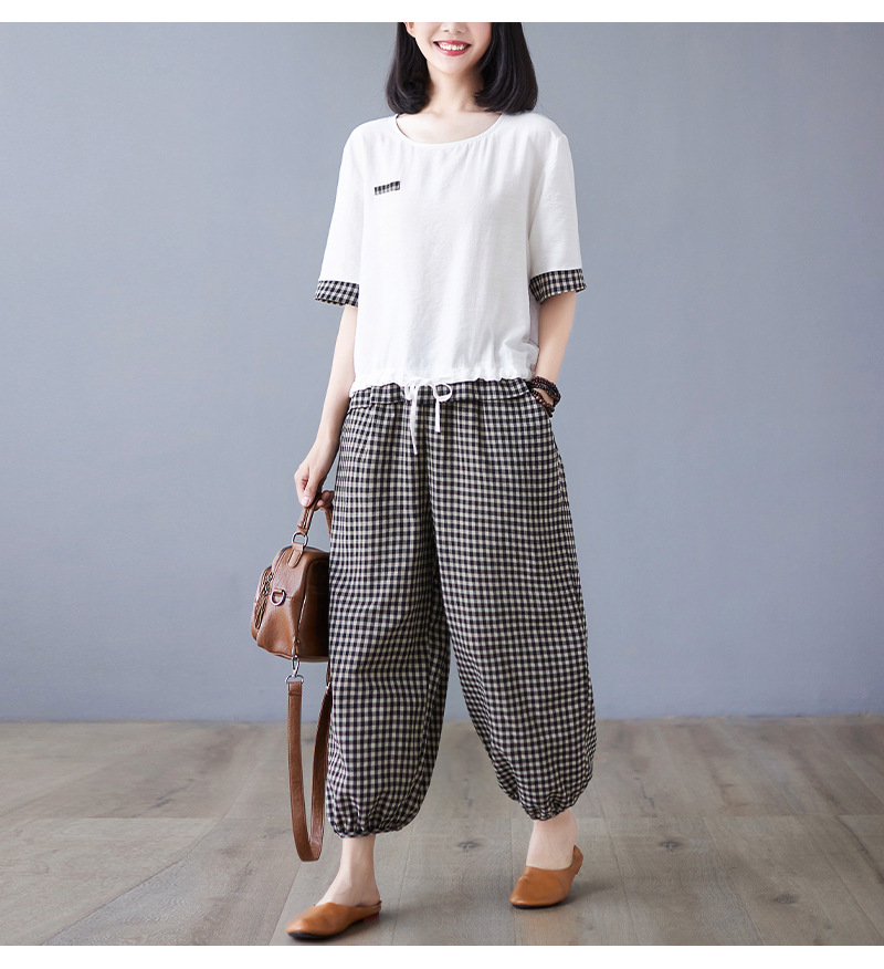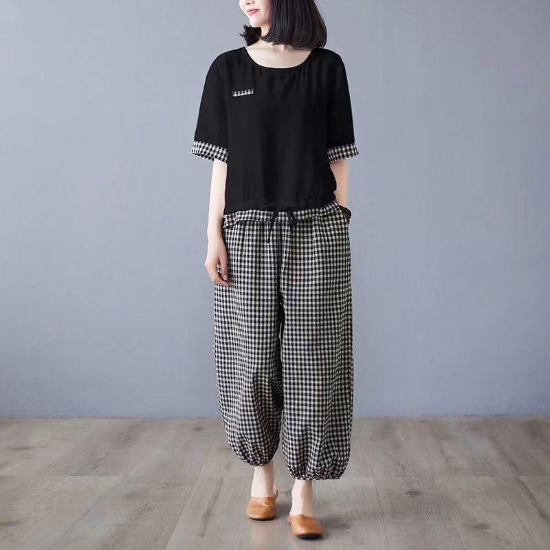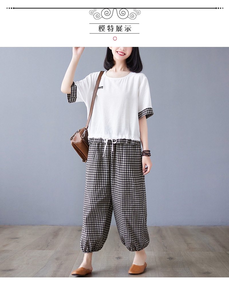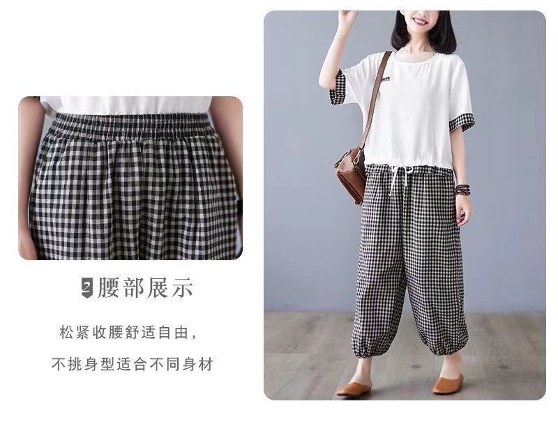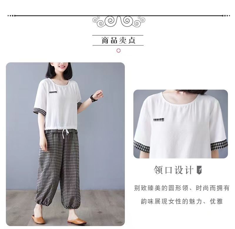 MZ18822中老年女装妈妈夏装棉麻套装2025新款大码短袖上衣夏季格子两件套