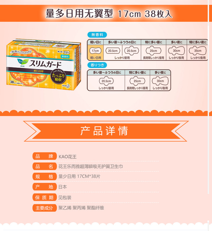 日本 Kao 花王乐而雅 纤薄轻量日用卫生护垫 17cm 38片