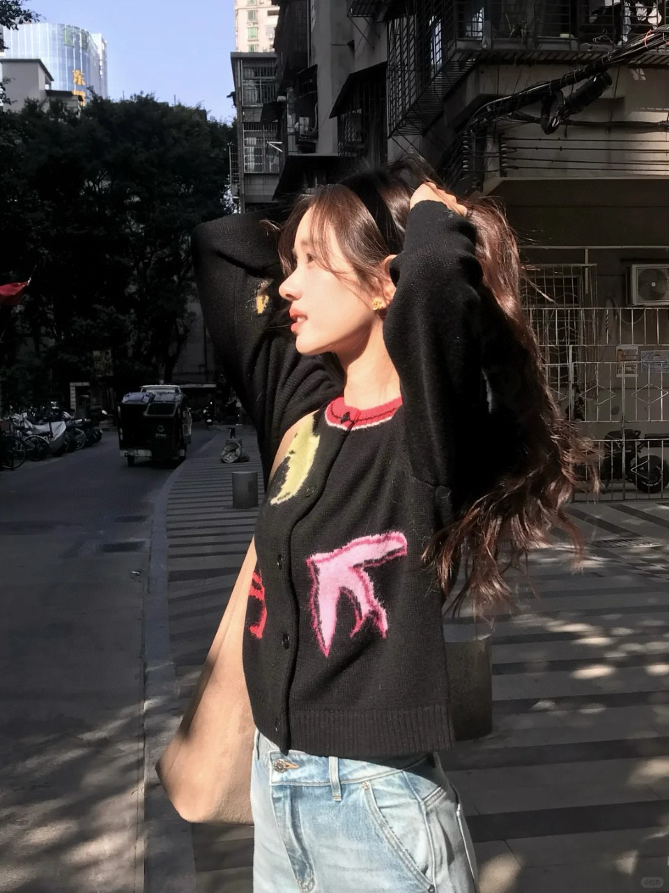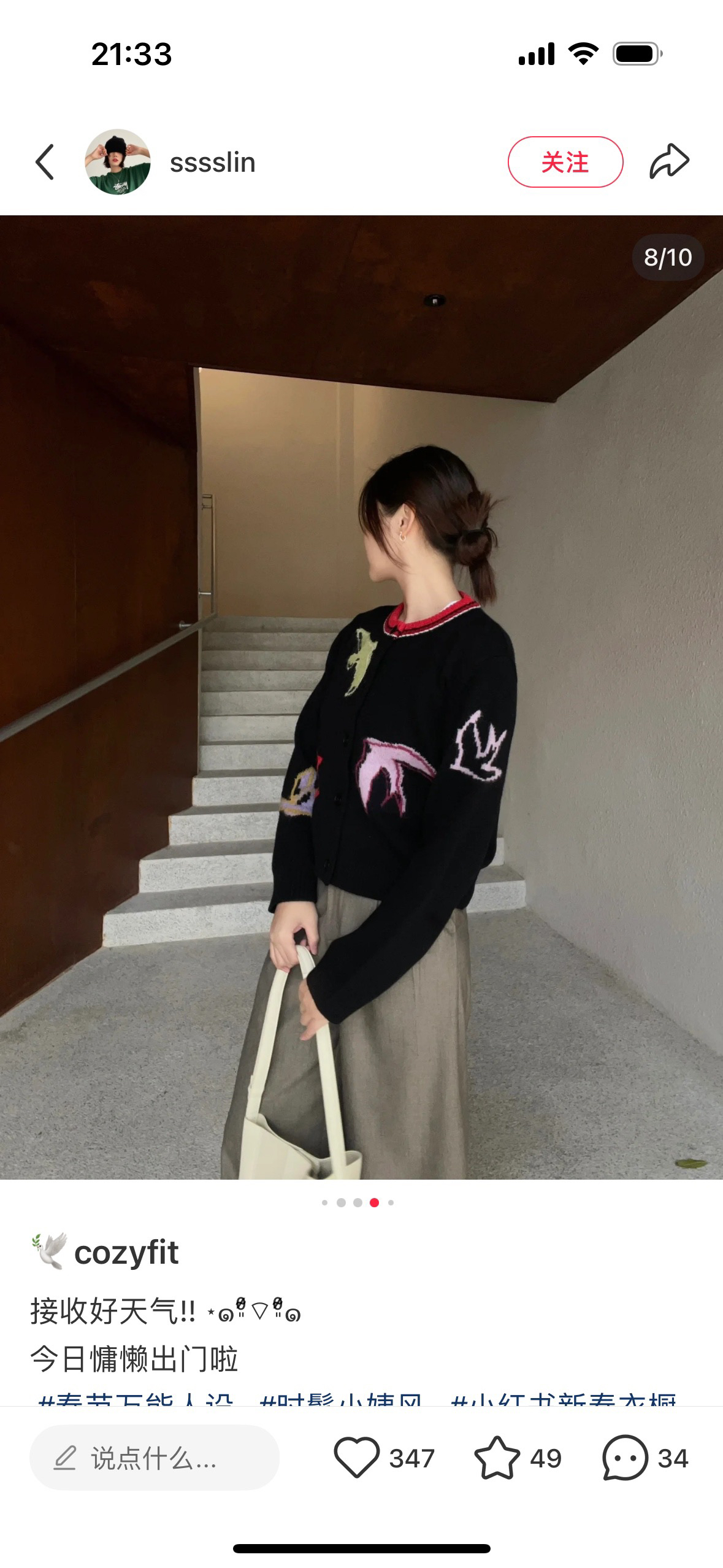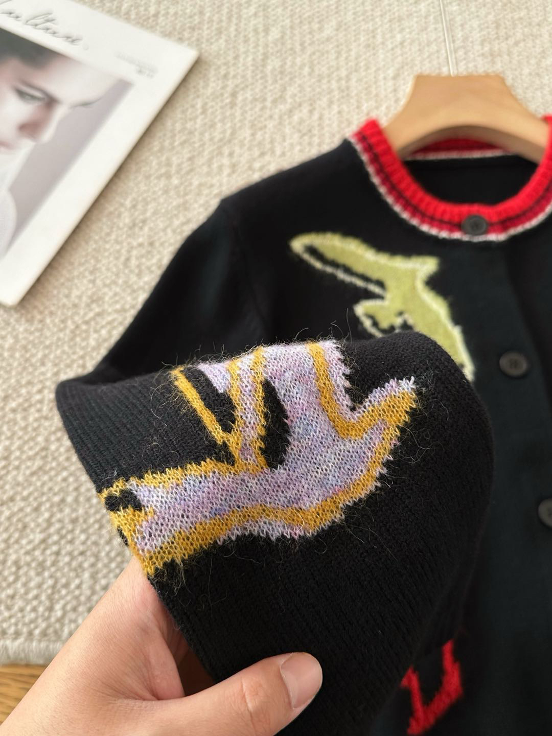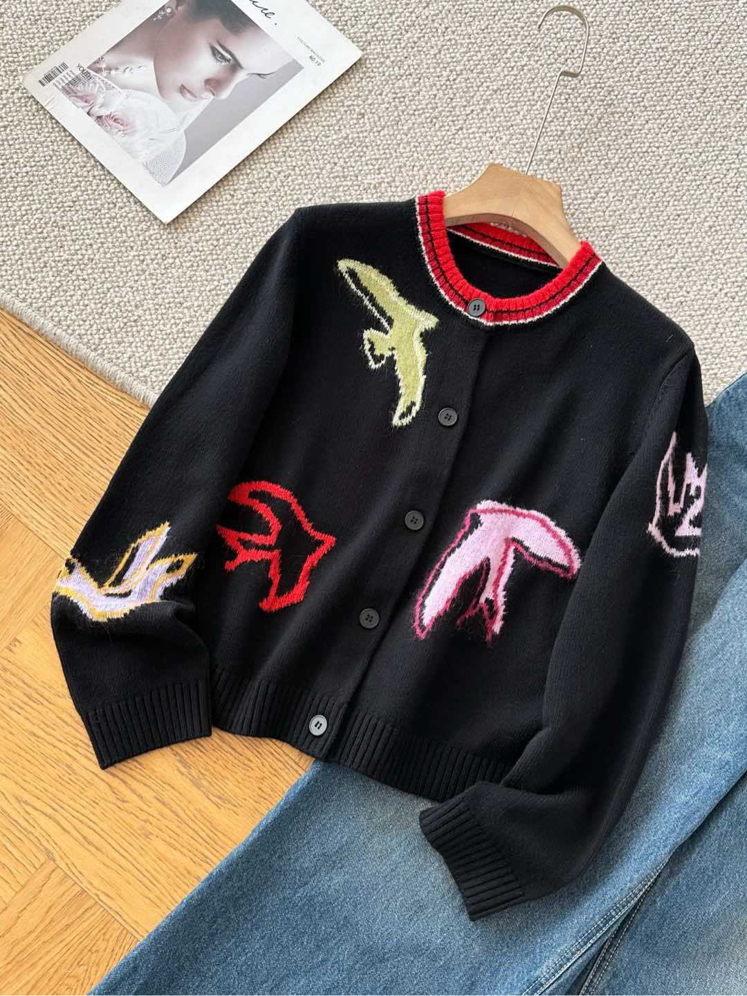 猫店折后售价802软币💰网红都在穿,彩色燕子提花上衣超绝!主色调是黑色,显瘦效果极佳,能巧妙修饰身材线条,彩色的燕子提花活泼又高级,充满春日活力