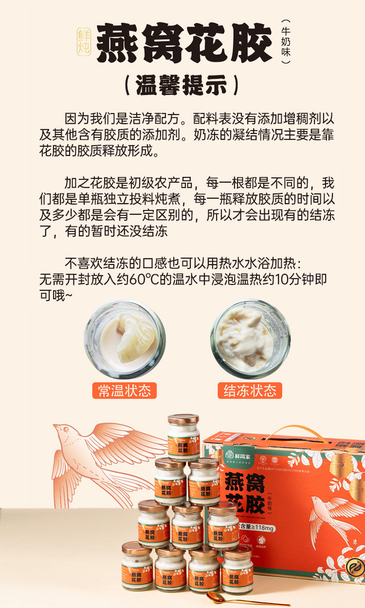 鲜炖燕窝花胶 燕窝每瓶放足118mg,给您加倍胶原蛋白。开盖即食 零添加;Q弹爽口 口感纯正;纯奶精炖不加一滴水。