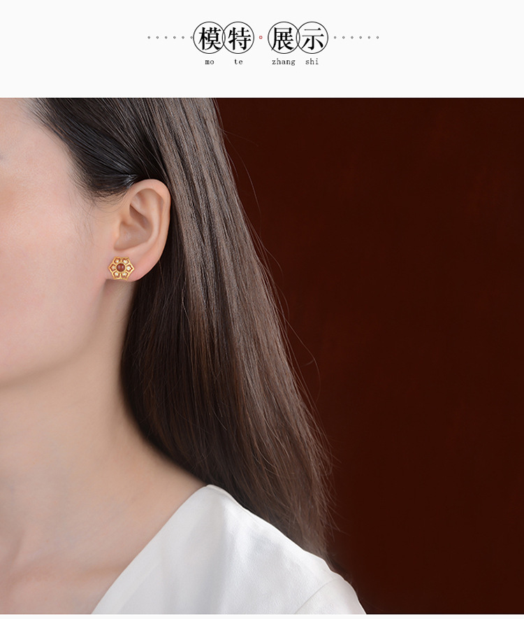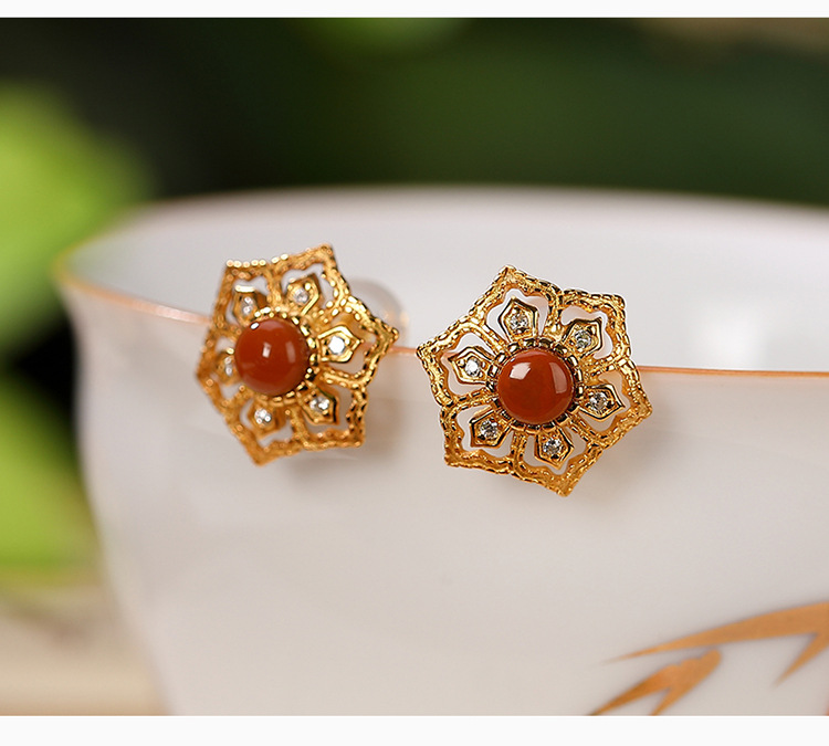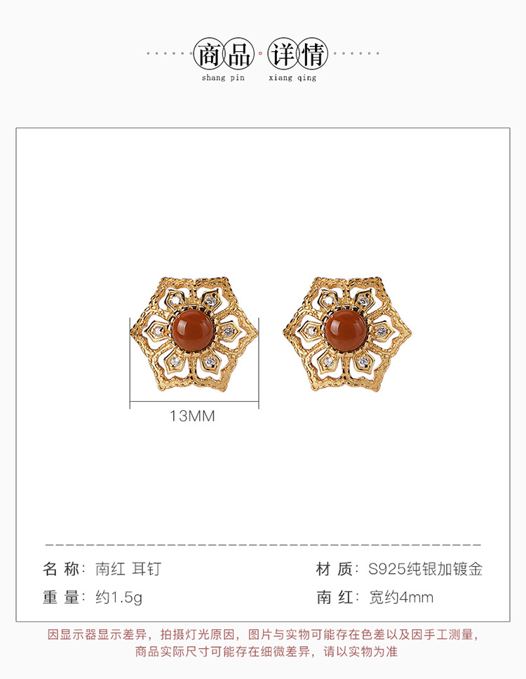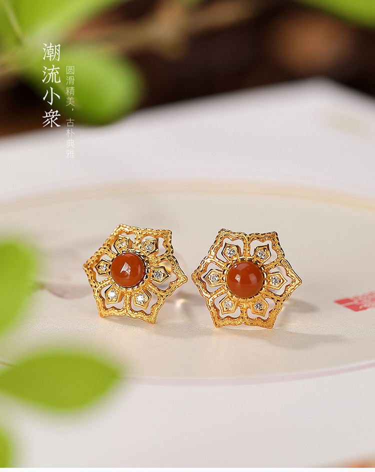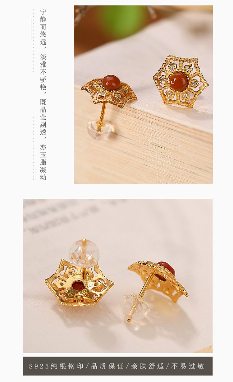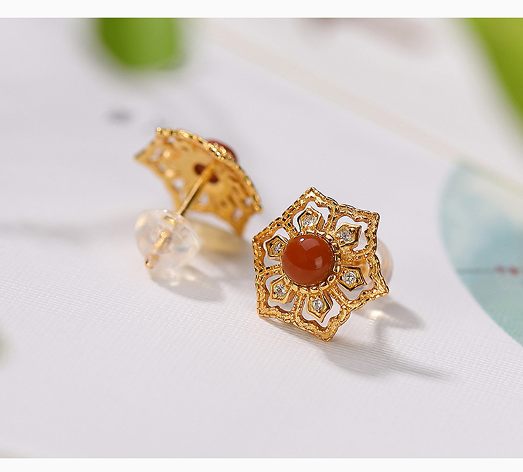 S925纯银镀金南红玛瑙个性镂空耳钉 CW