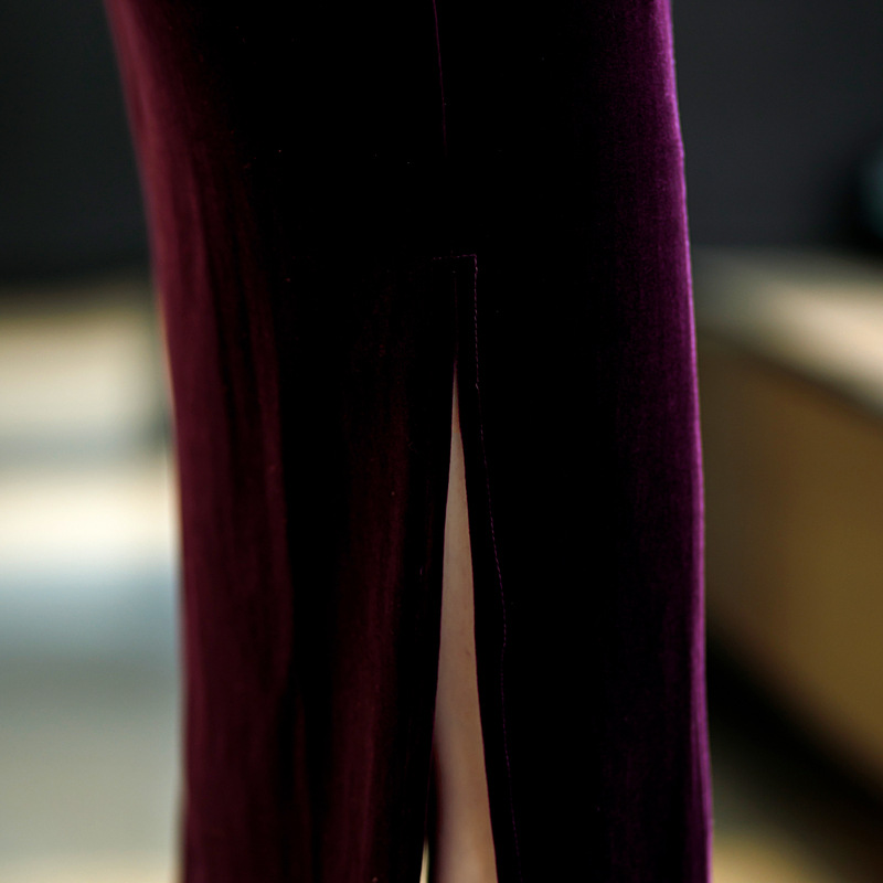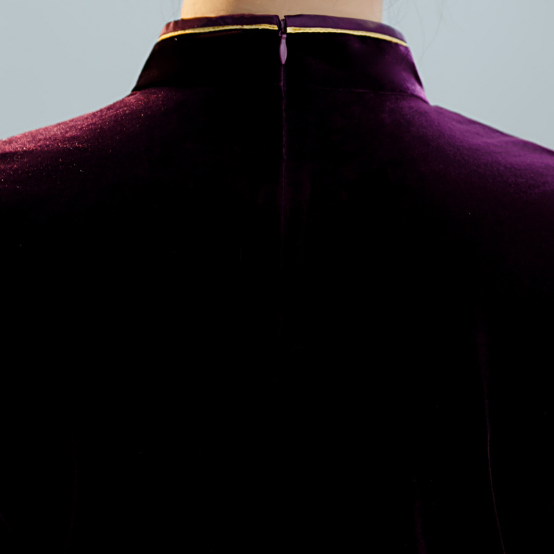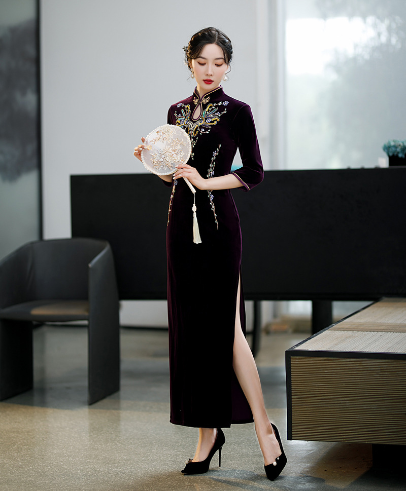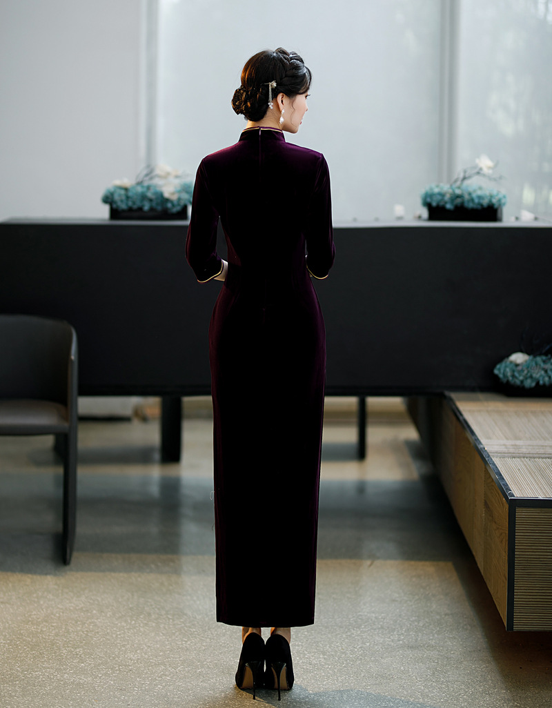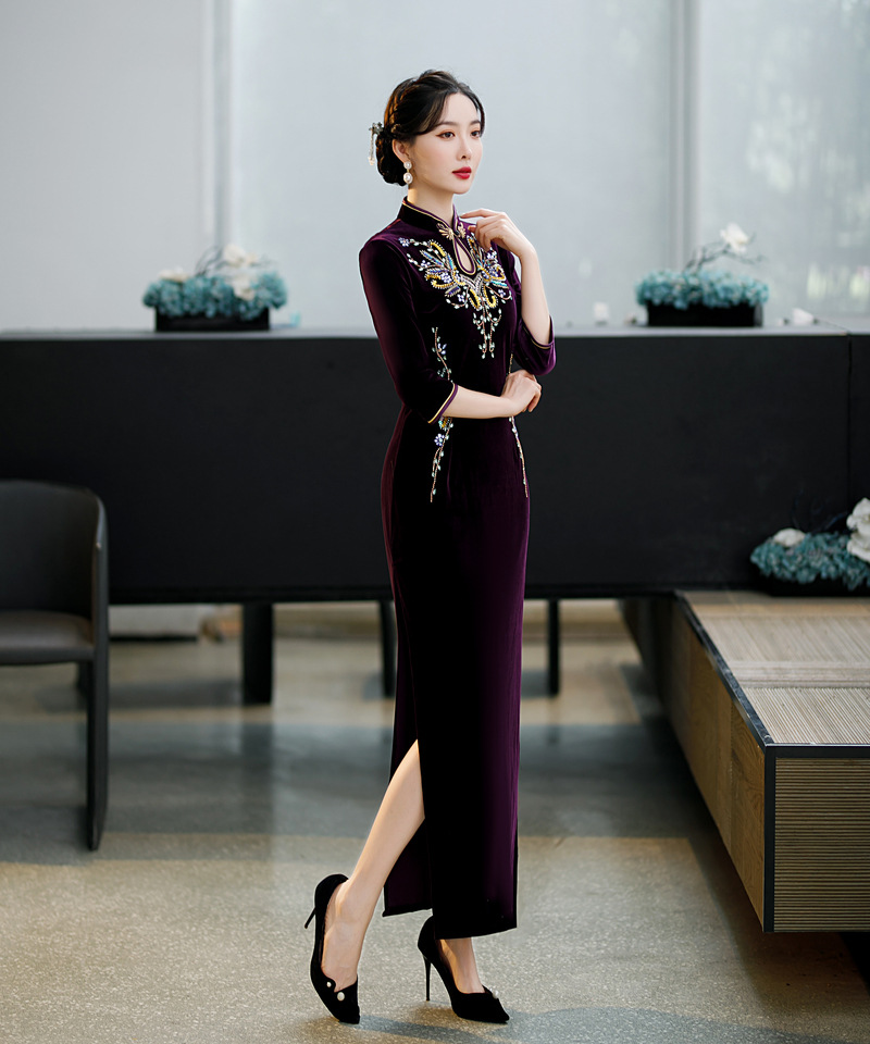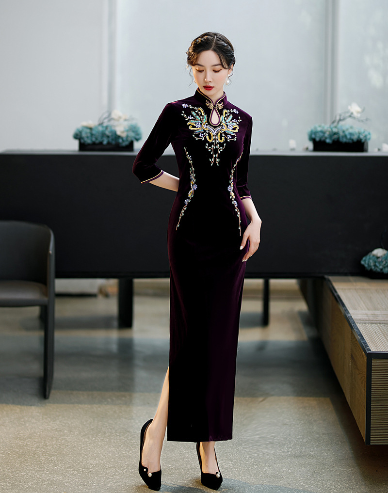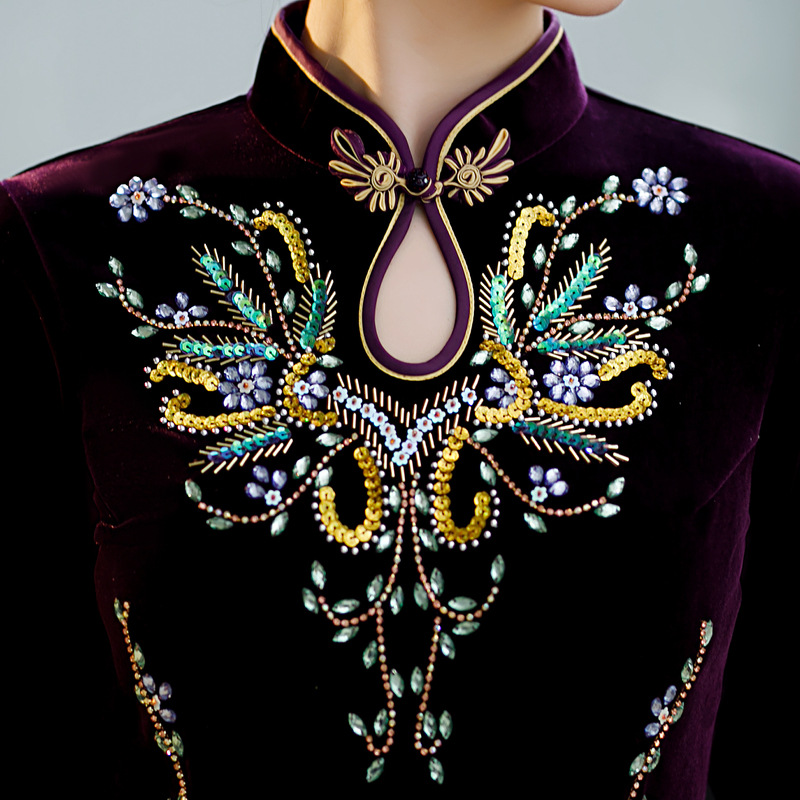 上海旗袍厂ZAYS-9111秋冬长款手工钉珠妈妈装旗袍时尚气质喜婆婆旗袍裙