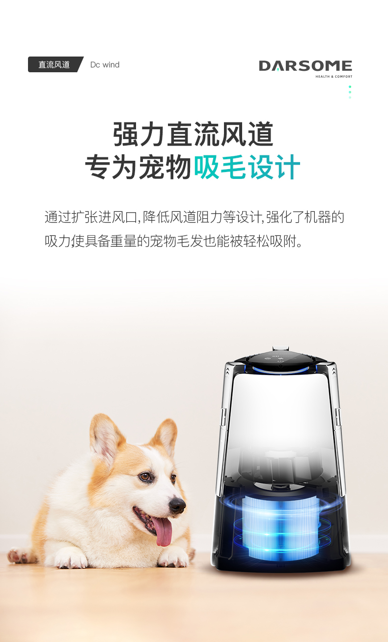 3、HEPA高效微尘过滤网+涡轮直流风道,专为宠物吸毛设计。