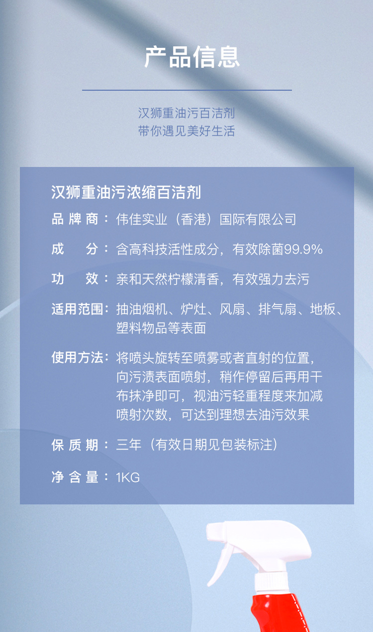 【门店直发】汉狮清洗油烟机去重油污浓缩百洁剂厨房强力除油剂清洁剂1kg