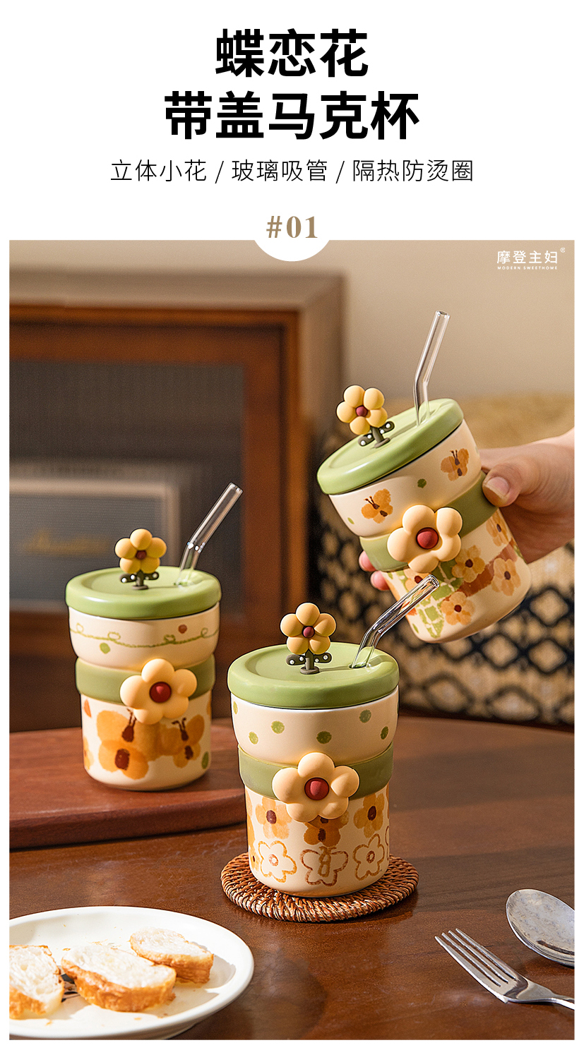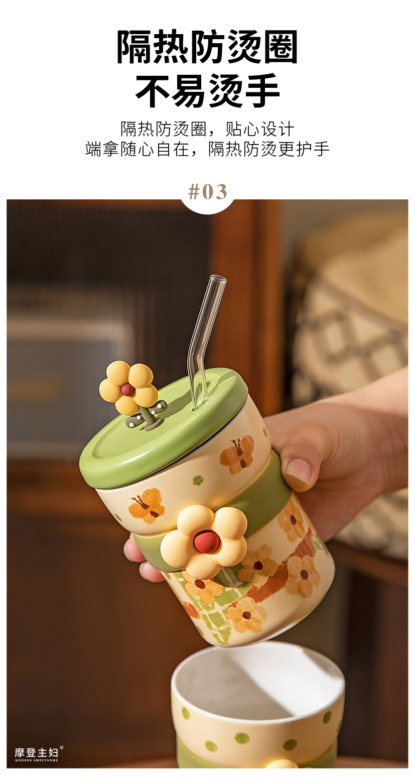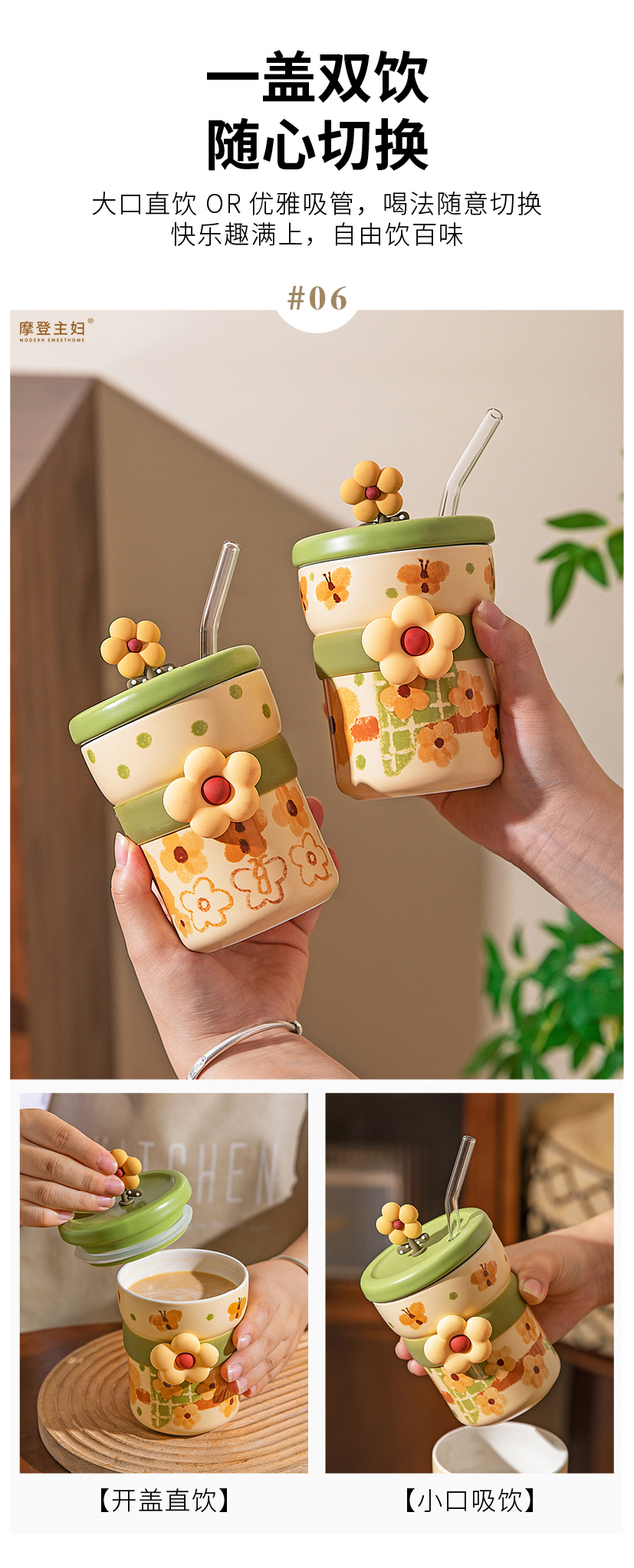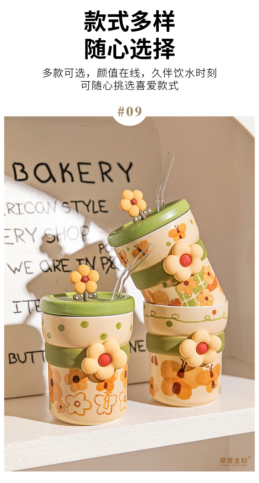 摩登主妇陶瓷带盖马克杯高颜值吸管杯便携家用喝水杯女生咖啡杯子