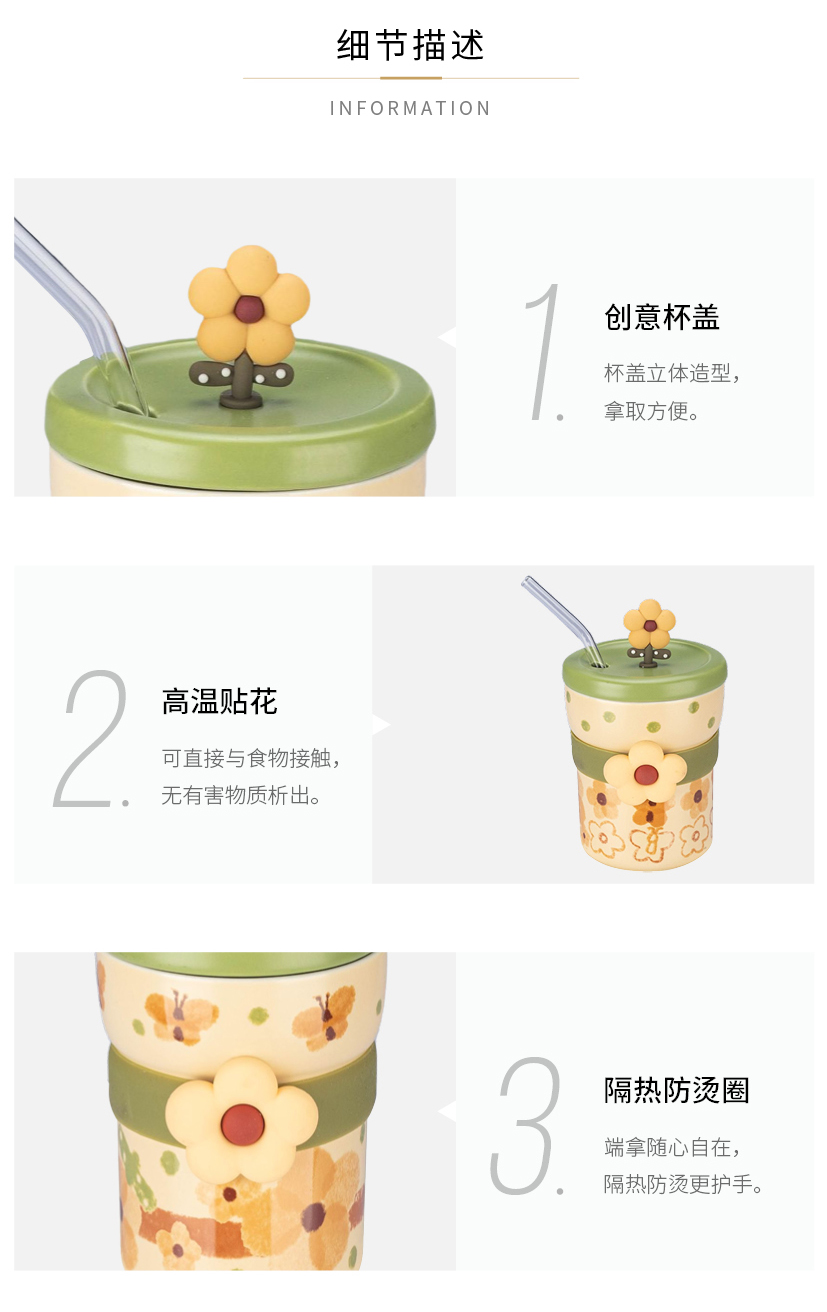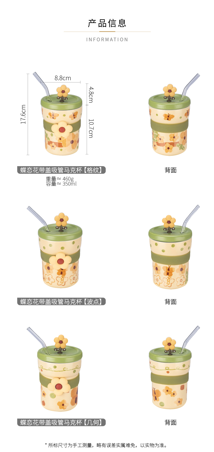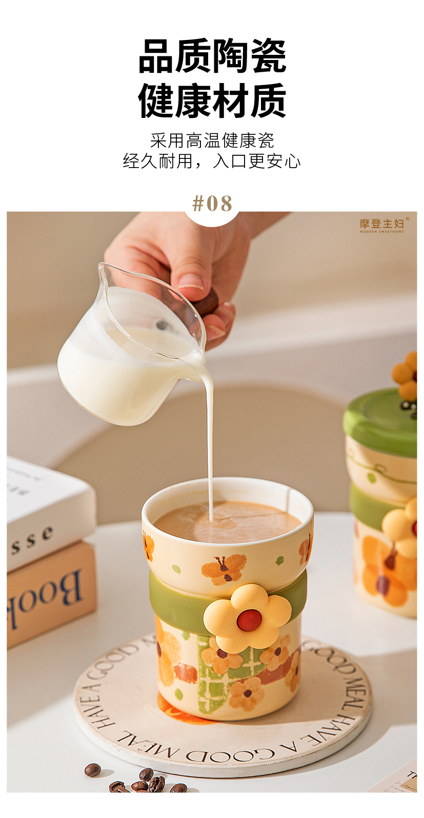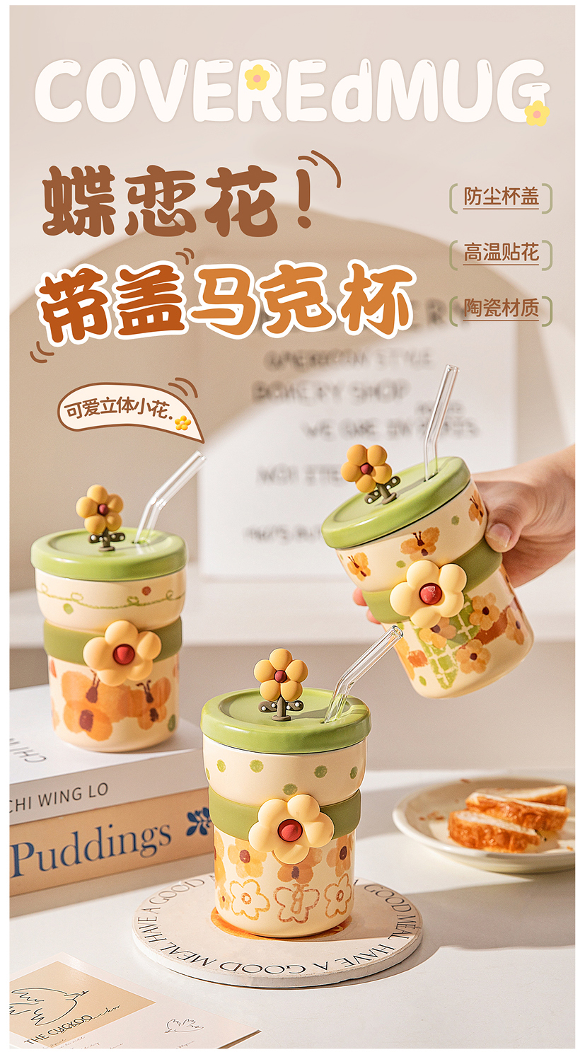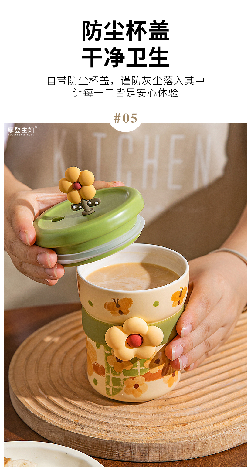 摩登主妇陶瓷带盖马克杯高颜值吸管杯便携家用喝水杯女生咖啡杯子