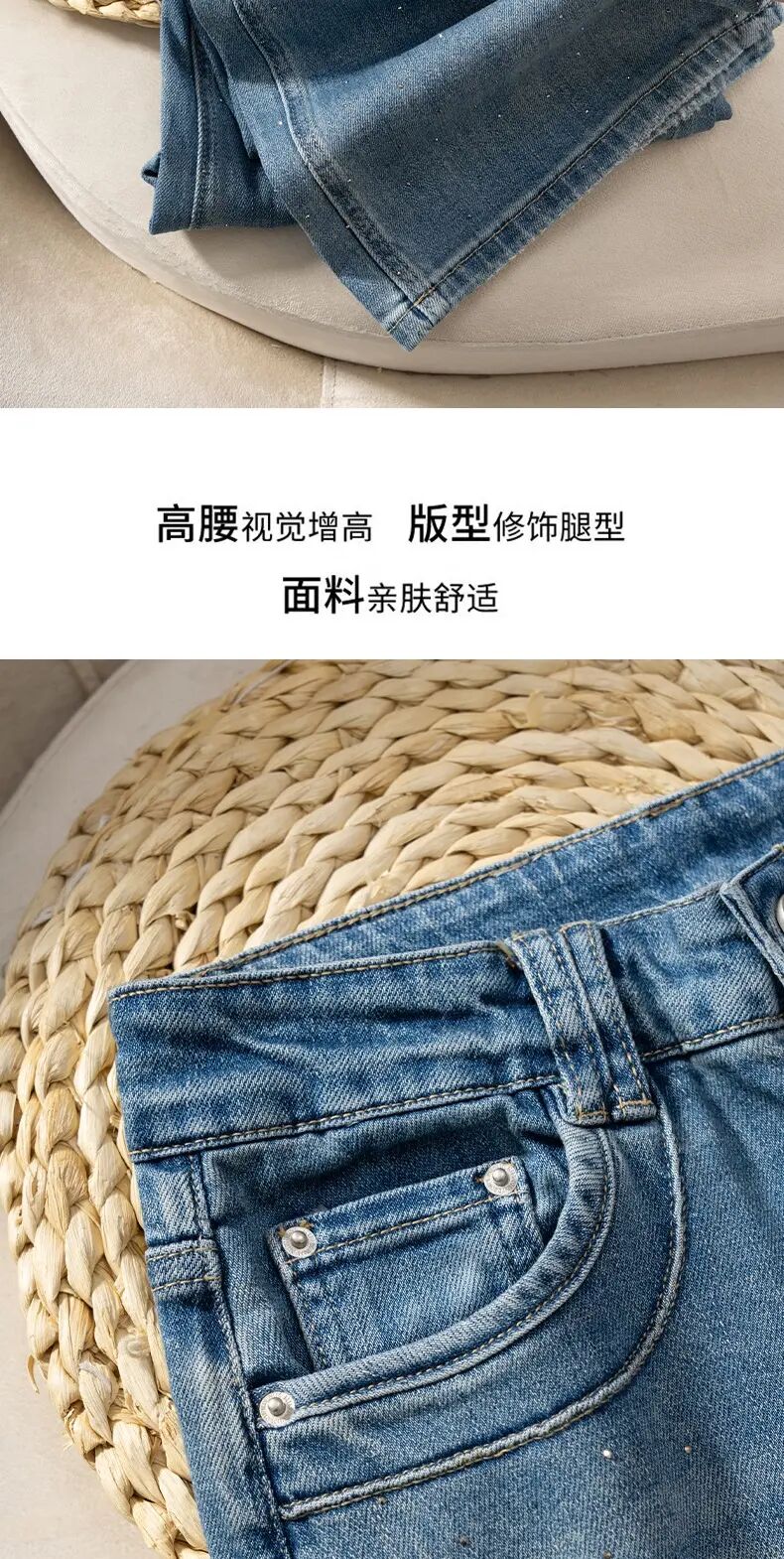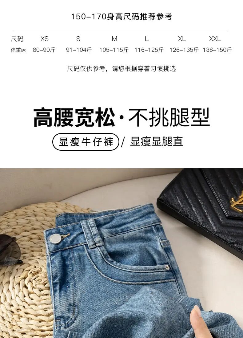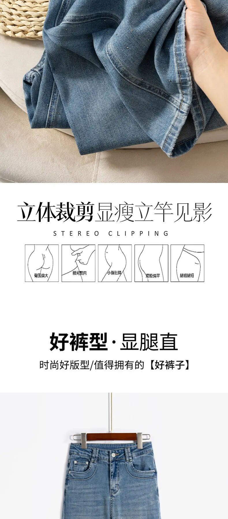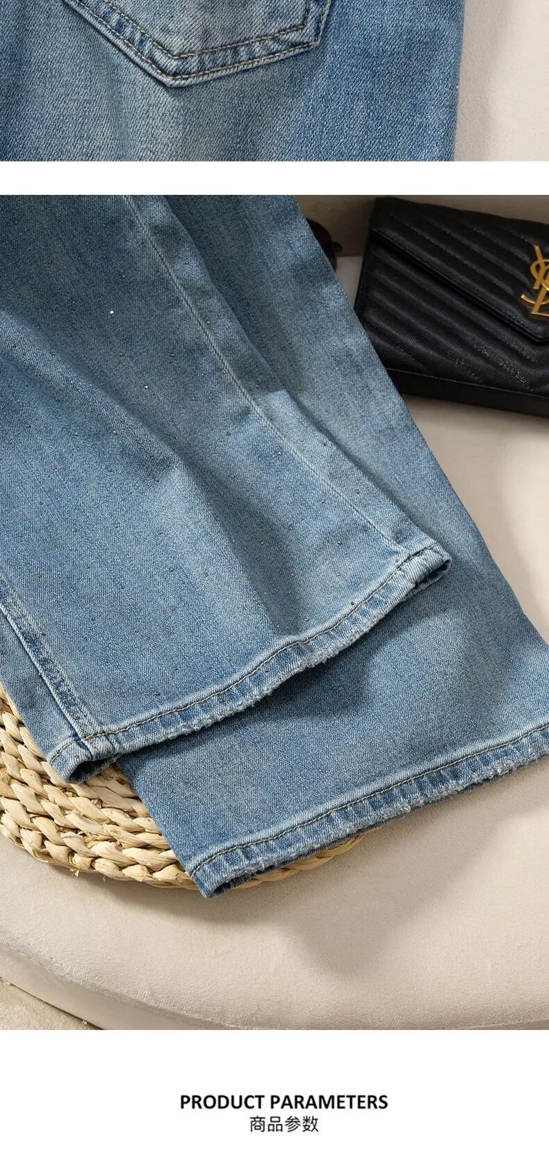 【自】全新升级【铂金会员183/天猫239/差价56】(01509) 洛诗琳做旧复古蓝烫钻牛仔裤夏季薄款阔腿裤高腰百搭裤子