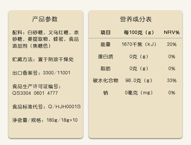| 配料表:白砂糖、义乌红糖、赤砂糖、姜提取物、蜂蜜 | |
