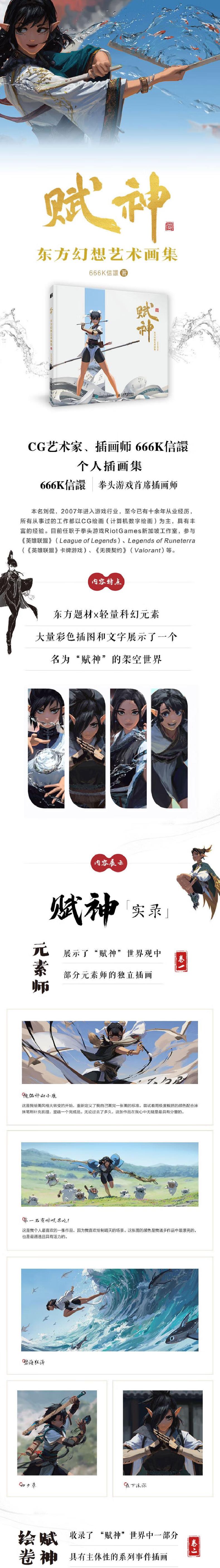 卖点1:会画水的插画师——666K信譞个人插画集,收录近百幅插画和线稿。卖点2:东方题材×轻量科幻元素,呈现不一样的CG艺术插画。