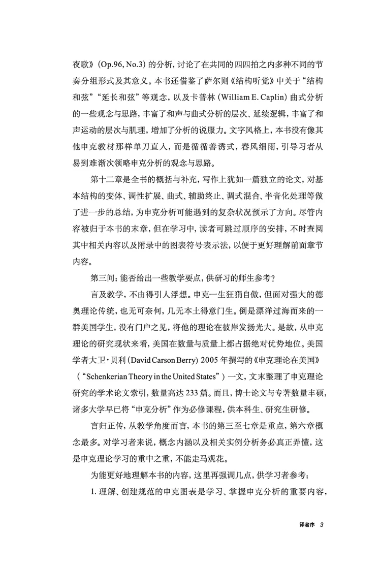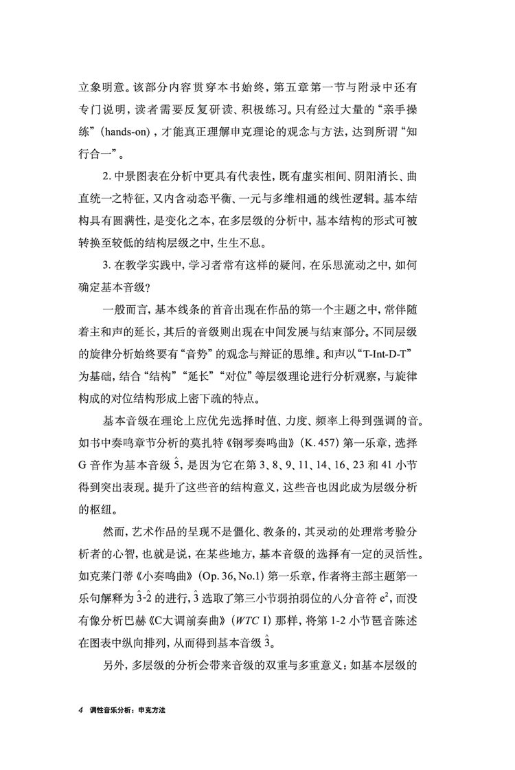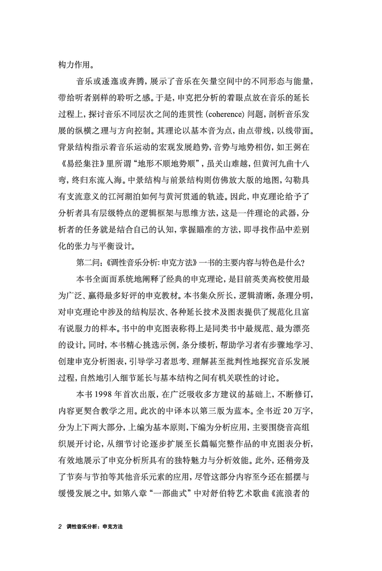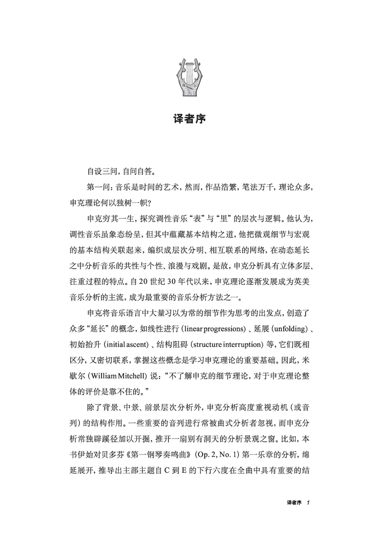 20世纪以来,由于西方音乐分析学的影响,已经体系化了的传统的曲式分析方法有了重大突破,在20世纪发展出来的新型音乐分析法,影响力较大的是奥地利音乐理论家、教育家海因里希•申克的分析方法——申克分析法。申克分析法将音乐作品作为一个有机的整体,以图表的形式,对音乐的深层结构进行简化还原,通过对音与音、和弦与和弦的分析,不仅揭示出音乐作品的宏观结构关系,也深入到构成音乐作品的基本要素中,从而使人们能够得以更全面深入地透视音乐作品。申克这种剥去音乐的装饰细节,着力揭示作品的核心架构的分析方法,对西方乃至世界音乐理论研究都产生了很大的影响。本书正是美国音乐学者对申克分析法进行引介的一本音乐著作。全书分为“基本原则”和“分析应用”两大部分。“基本原则”部分涉及旋律与对位、低音线条与和声结构、线性写作技术、调性结构等内容;“分析应用”部分涵盖了一部曲式、二部曲式、三部曲式、奏鸣曲式等结构类型和原则。全书的章节设计安排充分彰显了其作为“分析实用教程”的条理性和序进性。此书的翻译引进不仅能大大拓宽中国音乐分析学界的学术视野,还有助于纠正过去因资料匮乏不成体系而造成的对申克分析思想的一些误解,并为有志于了解申克分析法的学生提供扎实的教材。