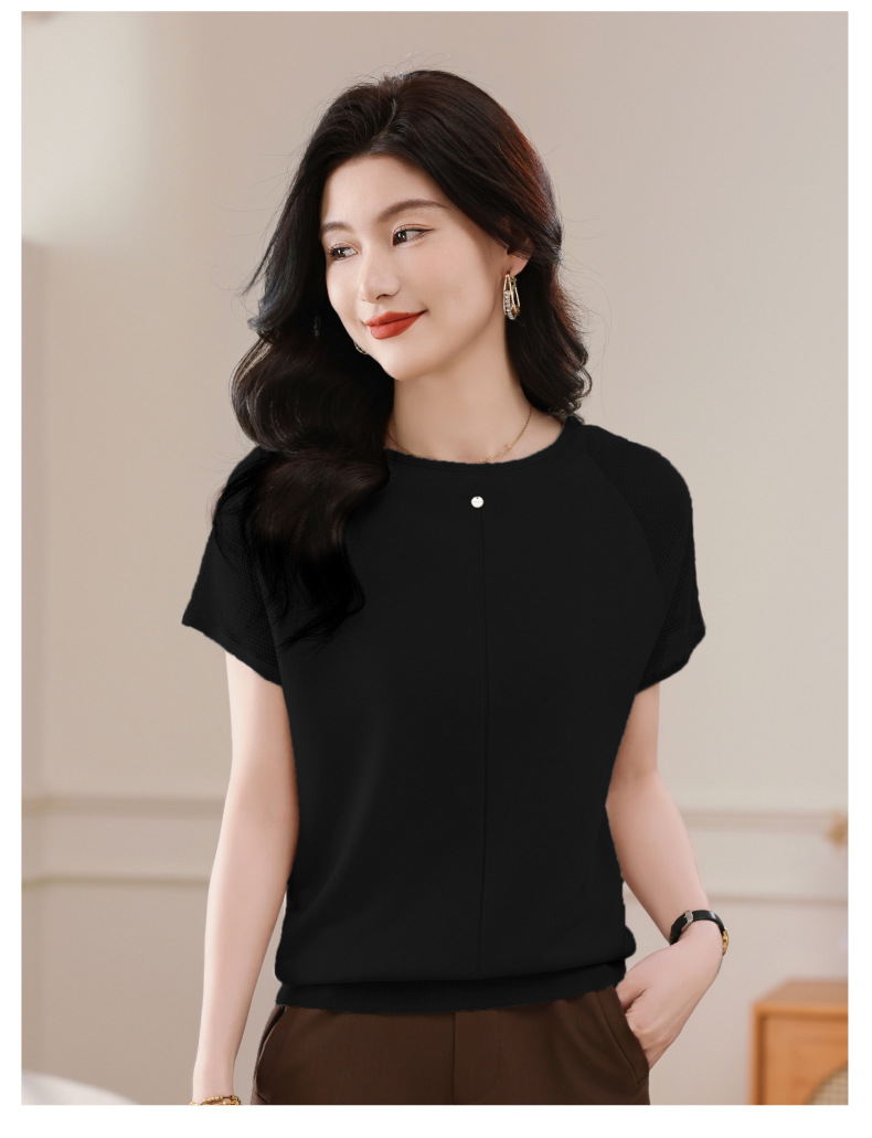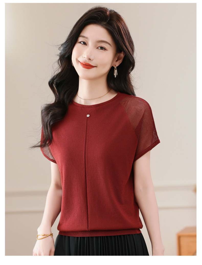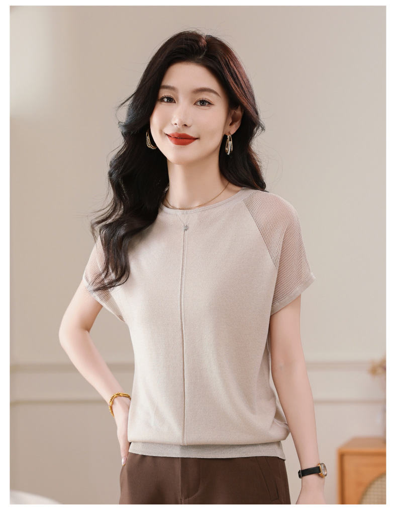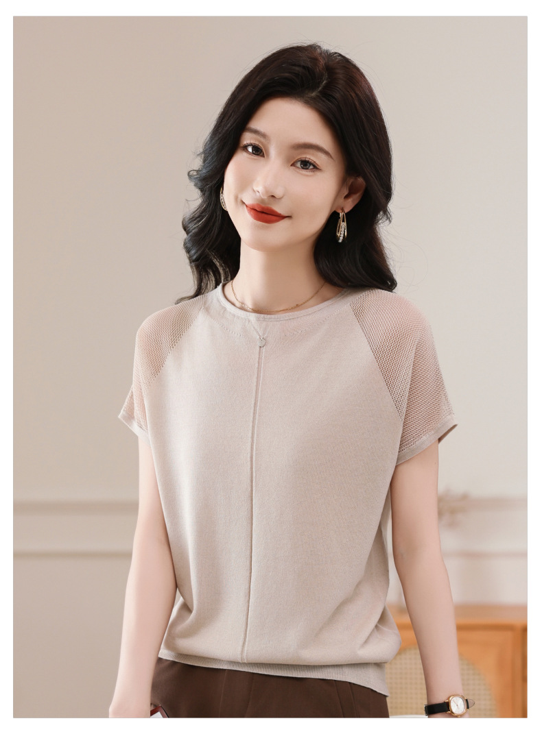 冰丝针织短袖t恤,圆领镂空宽松遮肉显瘦天丝体恤CC-5-6273
