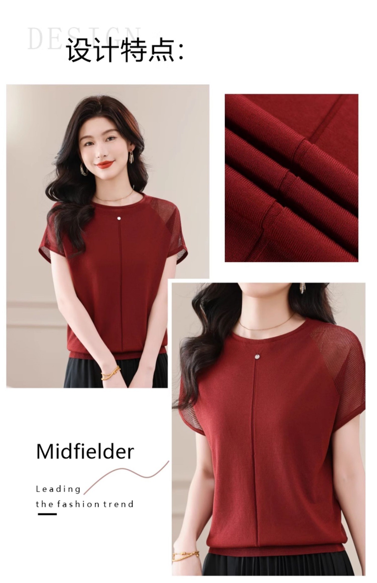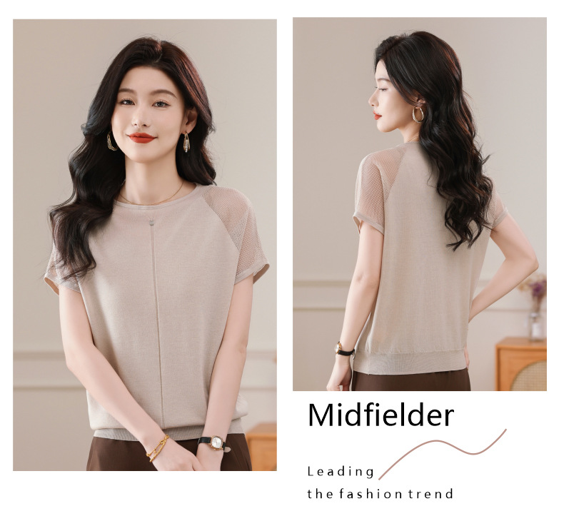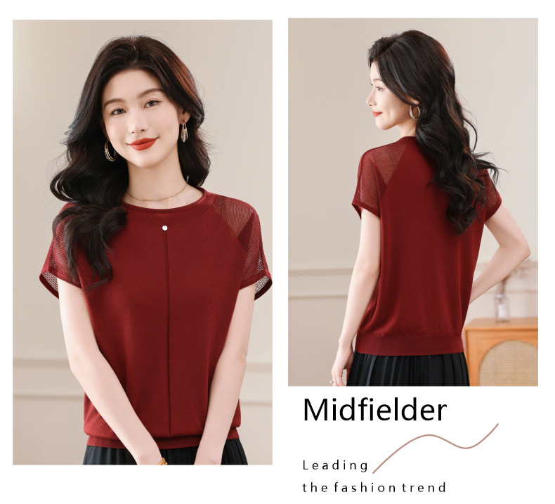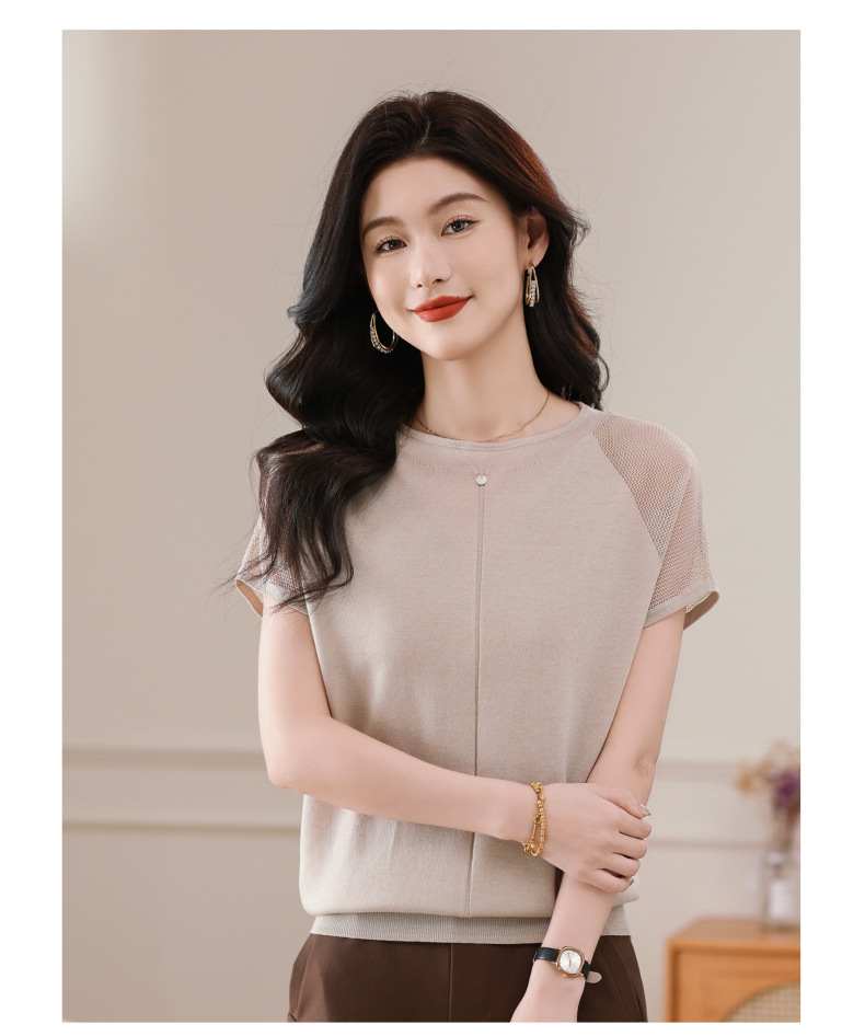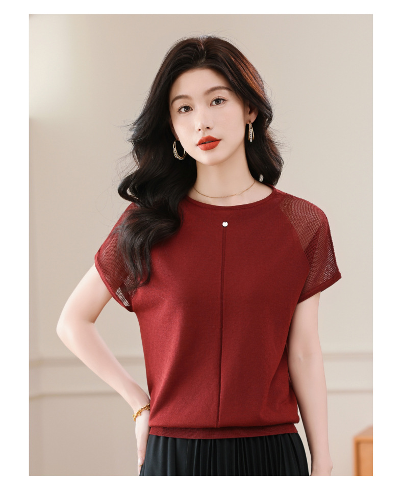 冰丝针织短袖t恤,圆领镂空宽松遮肉显瘦天丝体恤CC-5-6273