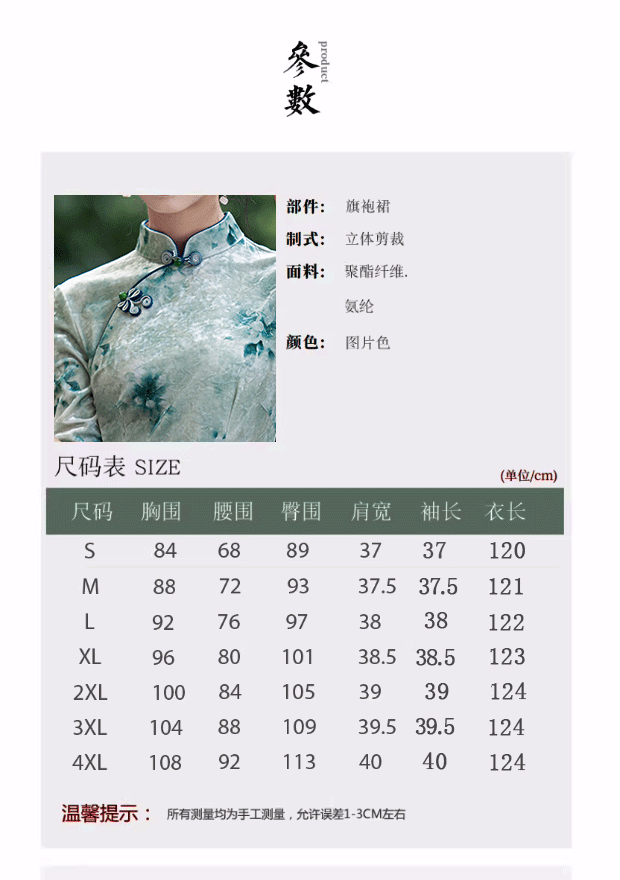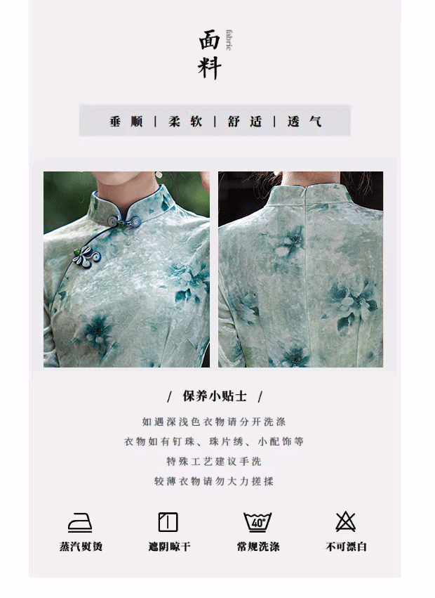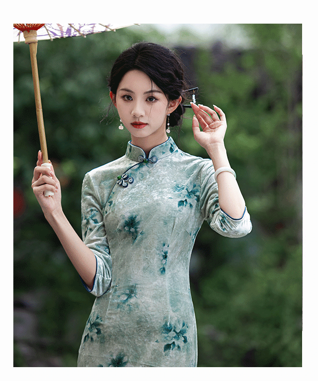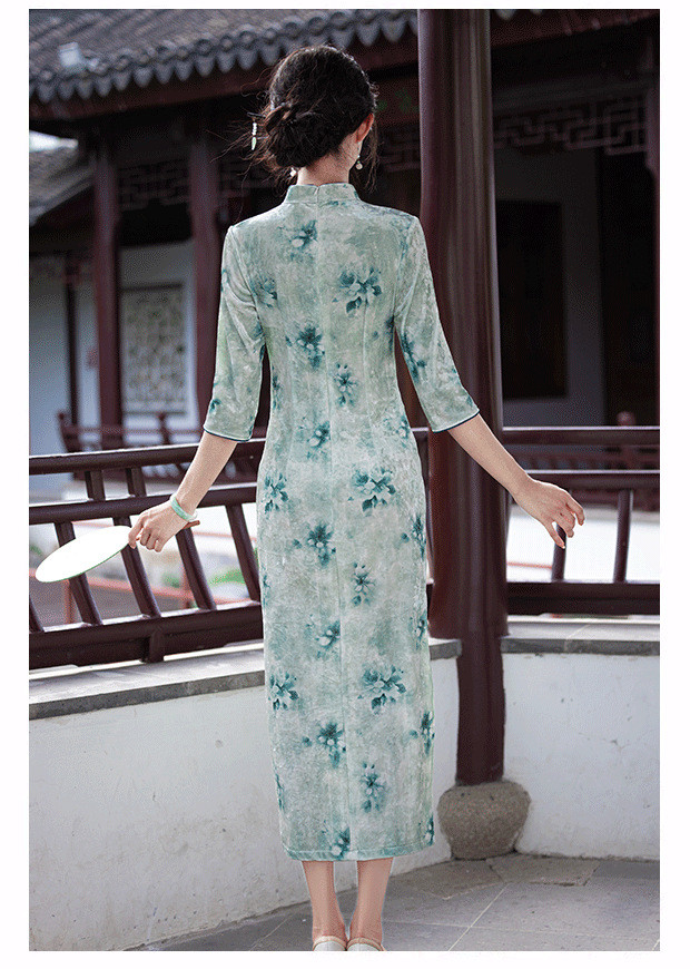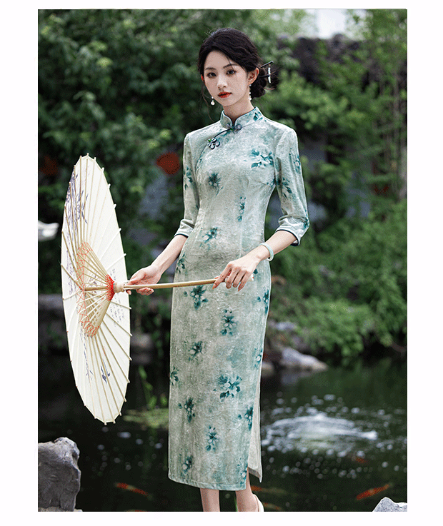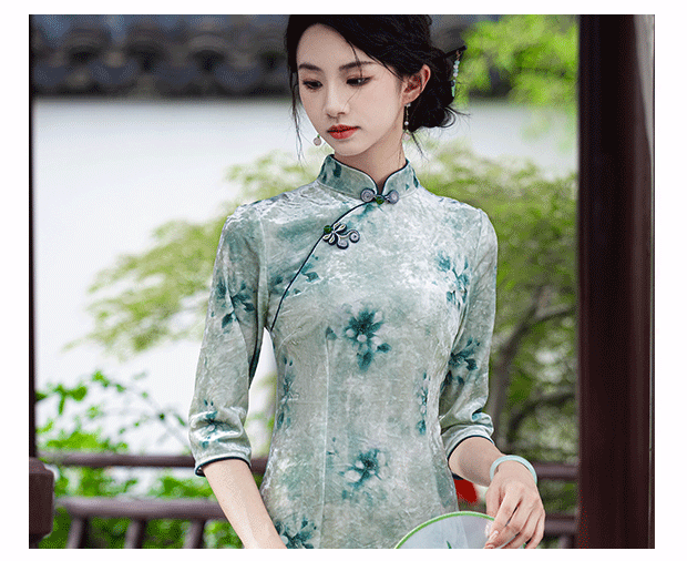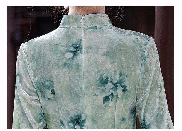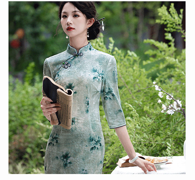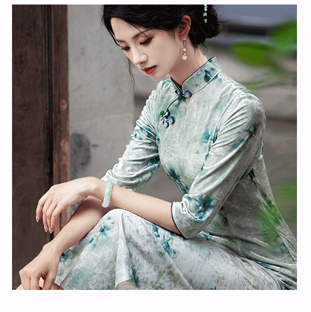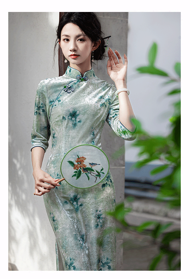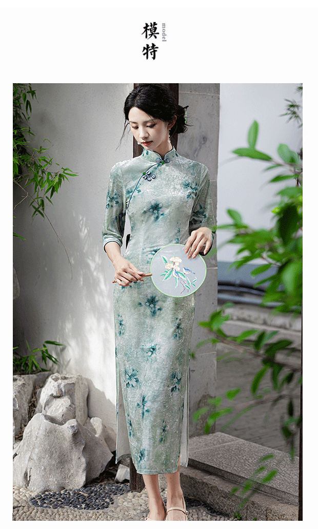 长袖改良优雅,丝绒印花素雅旗袍GR3056