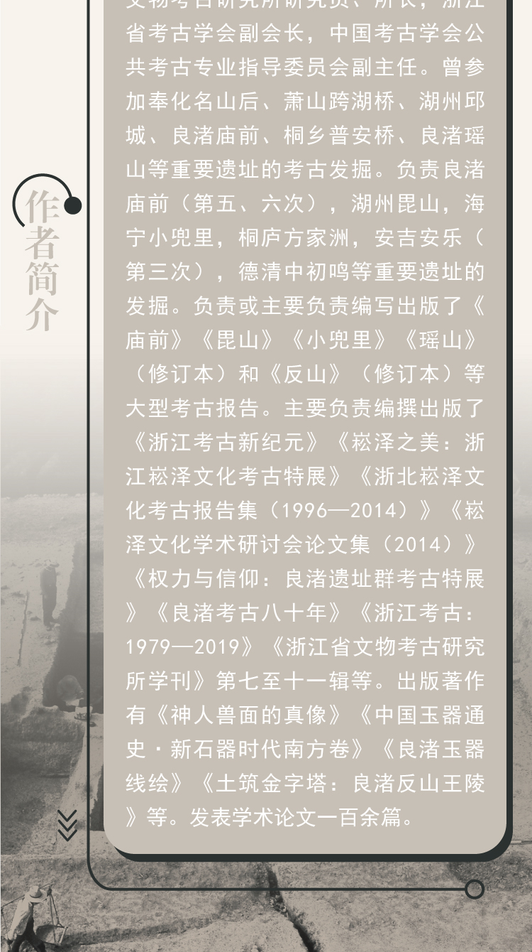 1967年5月生,浙江慈溪人。1985—1989年就读于中山大学人类学系考古学专业,1989年毕业至今供职于浙江省文物考古研究所。现浙江省文物考古研究所研究员、所长,浙江省考古学会副会长,中国考古学会公共考古专业指导委员会副主任。曾参加奉化名山后、萧山跨湖桥、湖州邱城、良渚庙前、桐乡普安桥、良渚瑶山等重要遗址的考古发掘。负责良渚庙前(第五、六次),湖州毘山,海宁小兜里,桐庐方家洲,安吉安乐(第三次),德清中初鸣等重要遗址的发掘。负责或主要负责编写出版了《庙前》《毘山》《小兜里》《瑶山》(修订本)和《反山》(修订本)等大型考古报告。主要负责编撰出版了《浙江考古新纪元》《崧泽之美:浙江崧泽文化考古特展》《浙北崧泽文化考古报告集(1996—2014)》《崧泽文化学术研讨会论文集(2014)》《权力与信仰:良渚遗址群考古特展》《良渚考古八十年》《浙江考古:1979—2019》《浙江省文物考古研究所学刊》第七至十一辑等。出版著作有《神人兽面的真像》《中国玉器通史·新石器时代南方卷》《良渚玉器线绘》《土筑金字塔:良渚反山王陵》等。发表学术论文一百余篇。