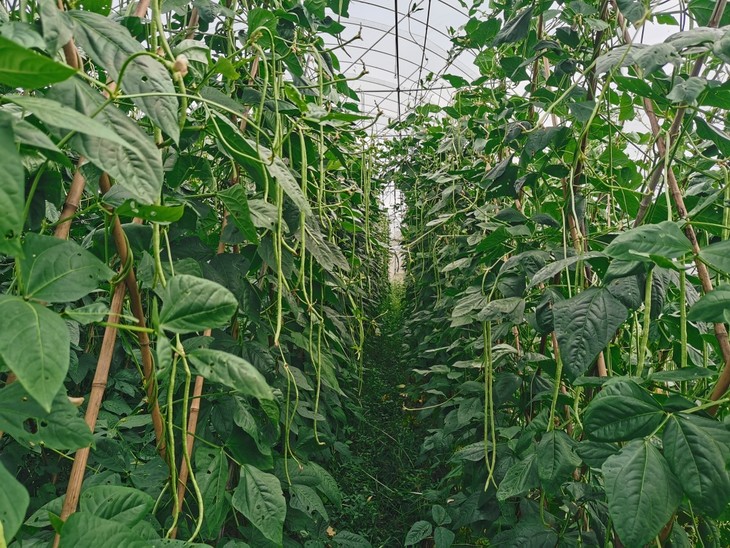 简易大棚内的豆角藤蔓(大棚主要用于夏季遮雨),正处于成熟季,垂下的豆角一条条生机勃勃。