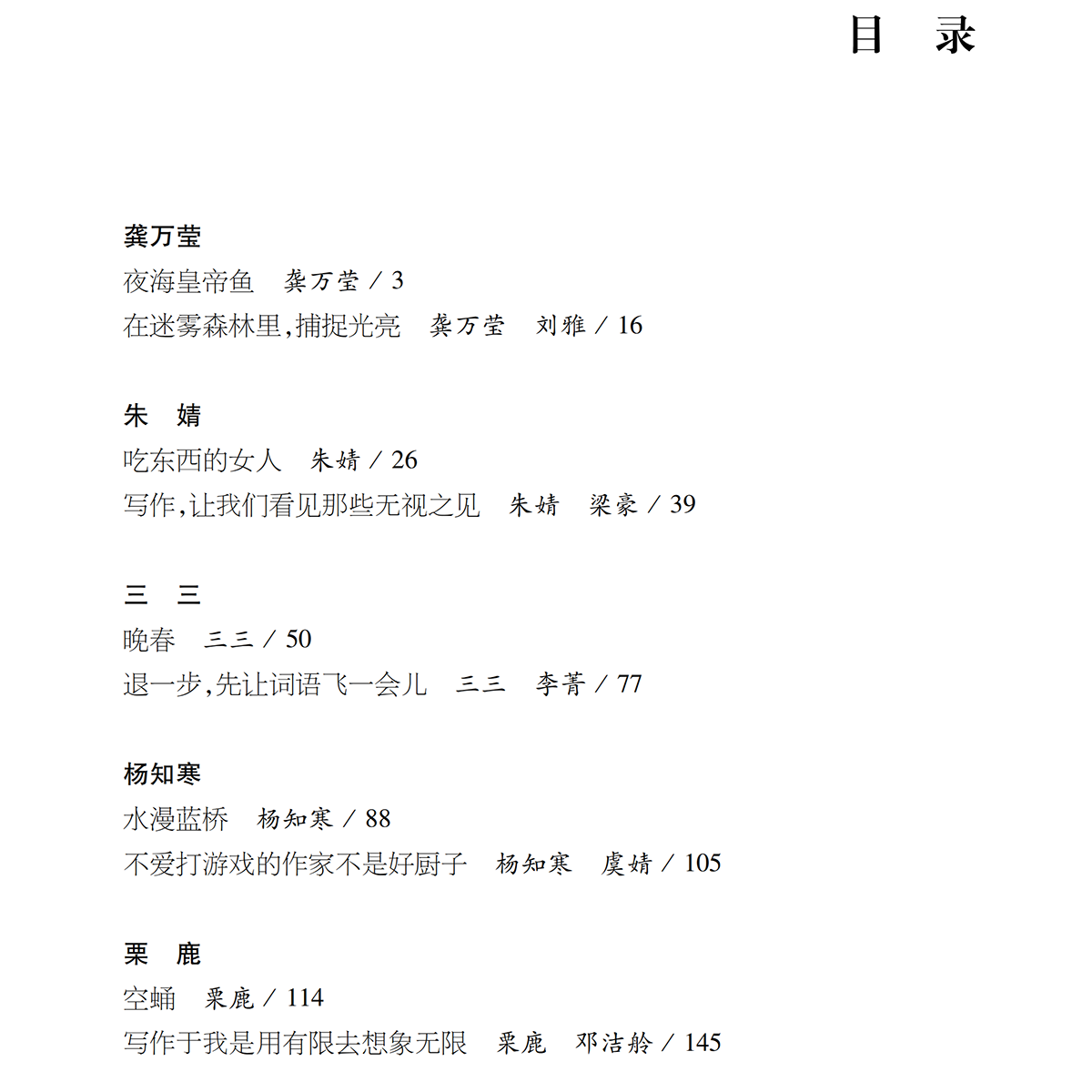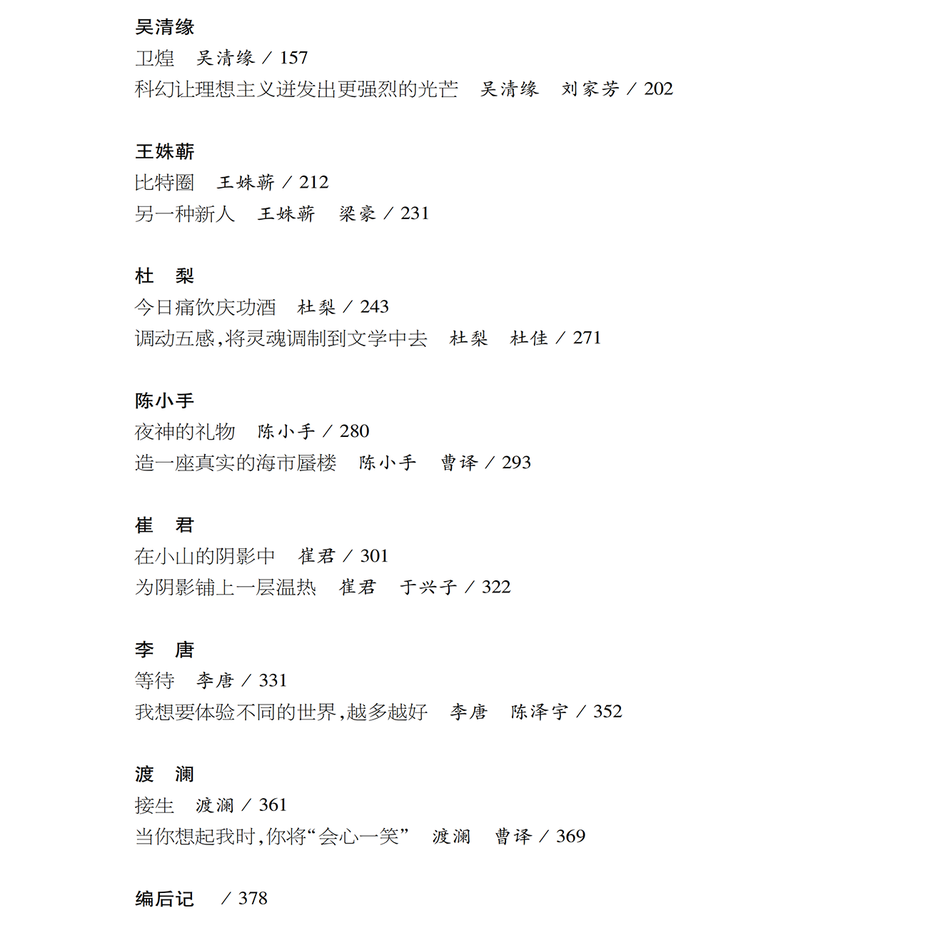 个梳理和呈现。按照文体划分,先从观察对象里选出首批12位小说家,将其作品与访谈一并集结成书。十二位书写者,各具特质,交错交响而蔚为大观。