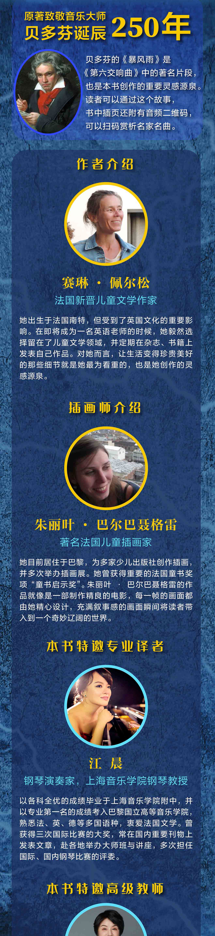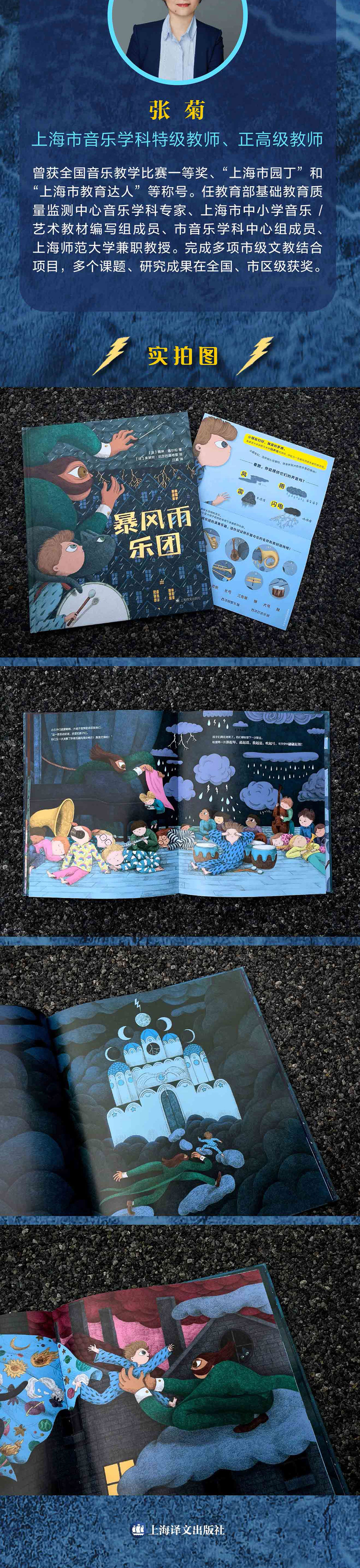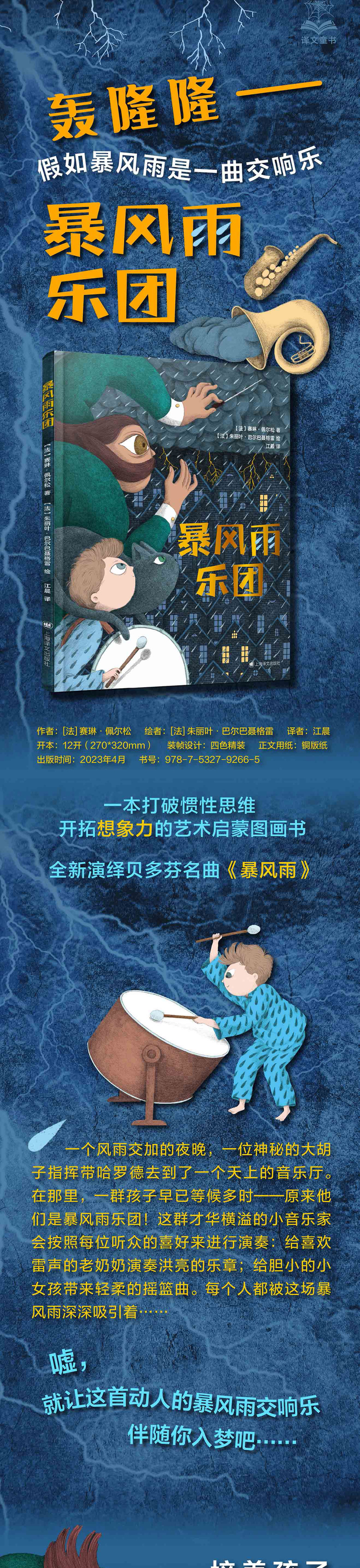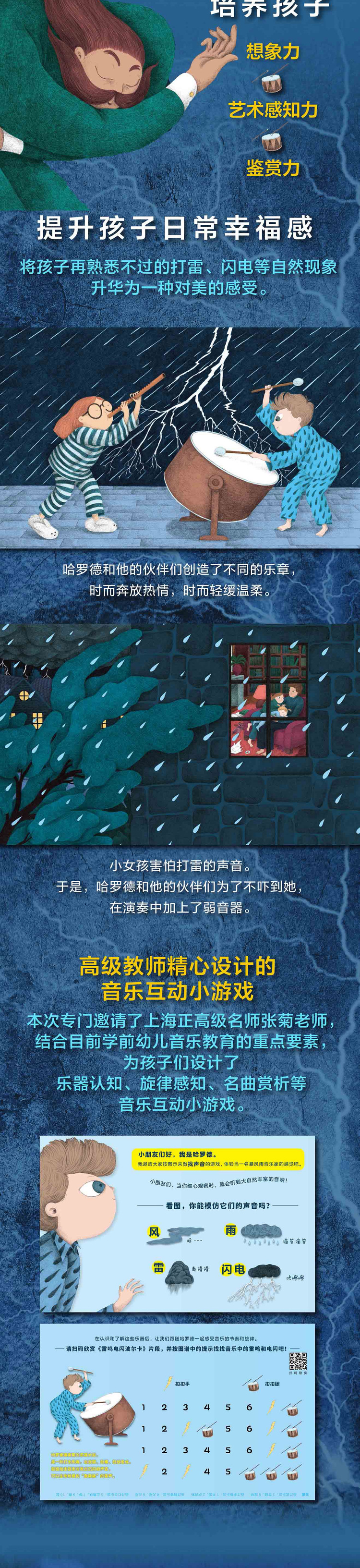 在⼀个暴风雨即将降临的夜晚,⼀个神秘的男⼦前来寻找⼩男孩哈罗德,他们要⼀起奔赴⼀场特殊的 ⾳乐会。⼀群⼩⾳乐家已经拿着乐器在演奏厅等候他们了,这个才华横溢的暴风雨乐队会根据听众的 喜好呈现出不同的旋律:⼀段洪亮的乐章送给喜欢雷声的奶奶,⼀段柔和的乐章送给害怕打雷的孩⼦们......嘘!就让这动⼈的交响乐伴随你⼊梦吧!图画书《暴风雨乐团》用非凡的想象⼒,富有艺术感 的插画,为⼩读者们呈现了⼀个⽓势磅礴、美好动⼈的暴风雨故事。这个故事不仅可以让⼩读者不再恐惧闪电、打雷等⾃然现象,也有助于开拓他们的视野,培养他们观察世界的新视⻆,因此⾮常适合作为低龄⼉童的艺术启蒙读物。