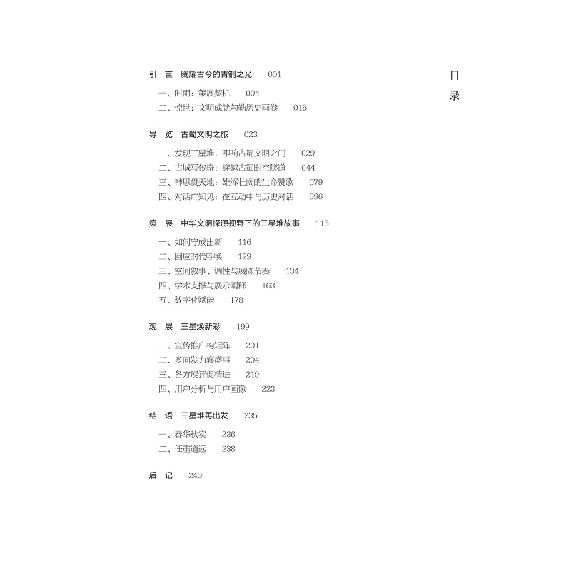 多维度阐释三星堆近百年考古历程、最新研究成果,以及三星堆融入中华文明多元一体格局历史轨迹;全面还原展览体系建构以及“四重对话”展陈理念形成过程;深度解读中华文明多元一体格局的宏大叙事,精彩讲述策展过程与重点展项、展品,以及三星堆考古与展览的传奇故事;建构博物馆从场馆建设、展览策划,到开放运营、教育传播等体系——《沉睡数千年 一醒惊天下:三星堆博物馆基本陈列策展笔记》均建立了成功范式。