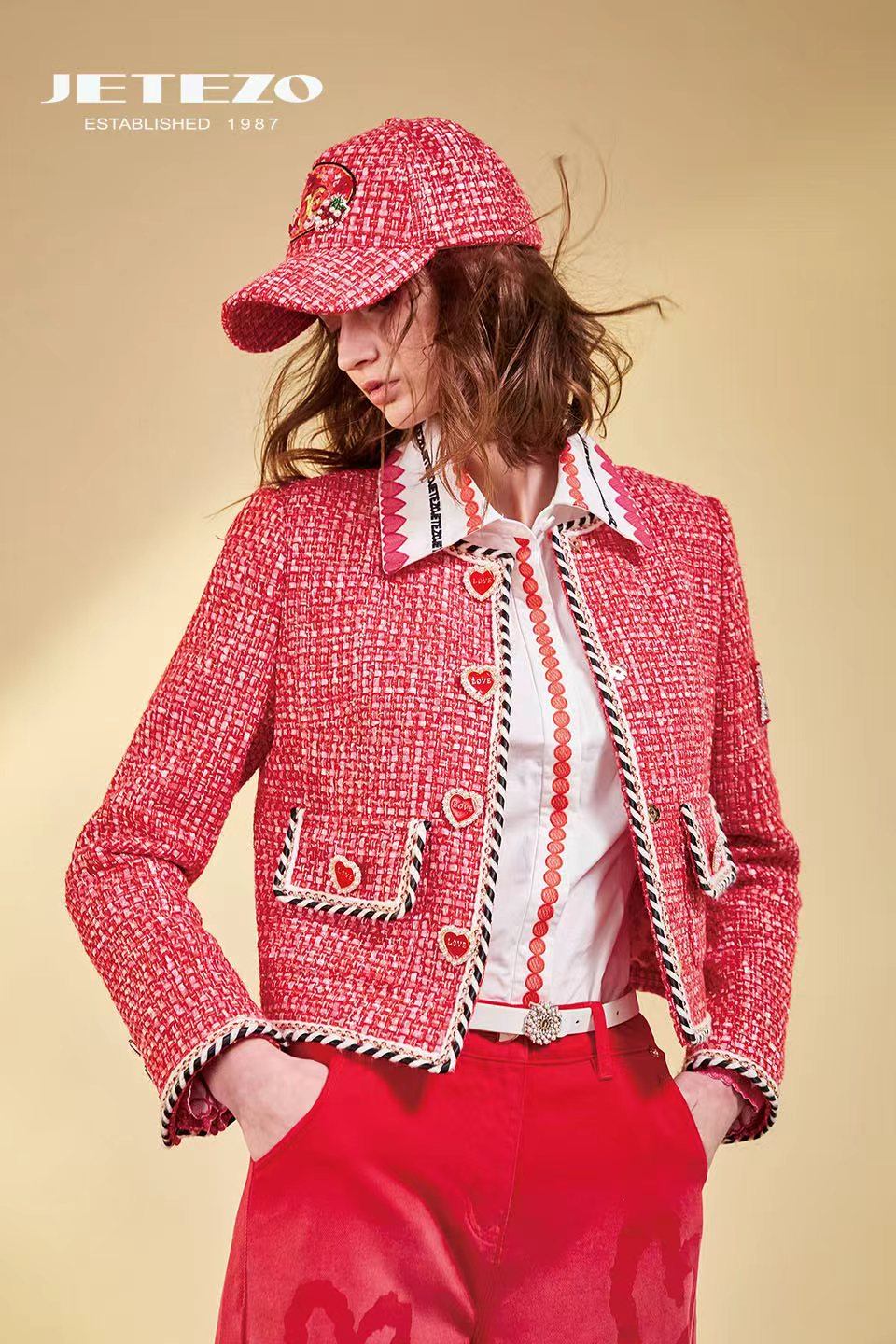 裘堤婼JETEZO红色交织香风优雅外套BE10452D1