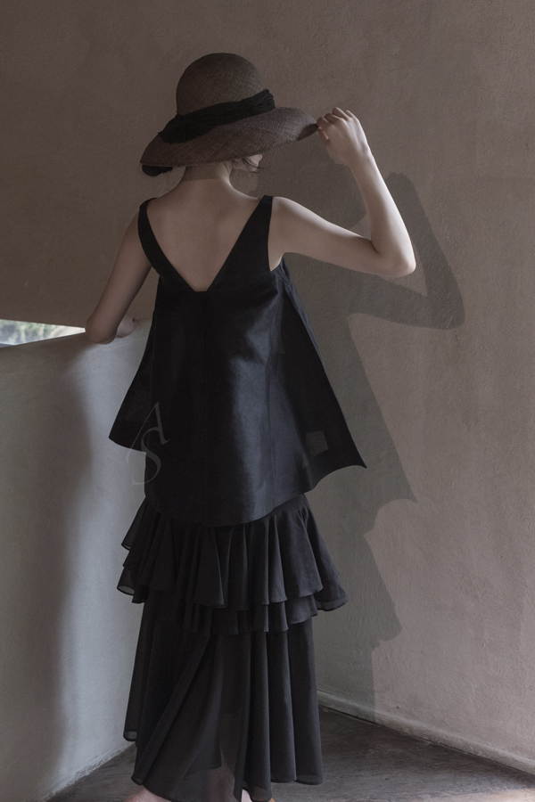 立体的裁剪线条呈现出花苞状的下摆,前后V领设计带来恰到好处的露肤度,亦修饰了肩颈线条。采用亚麻和真丝混织,穿着舒适透气而不失挺括的质感,黑色之中更添低调的光泽感。