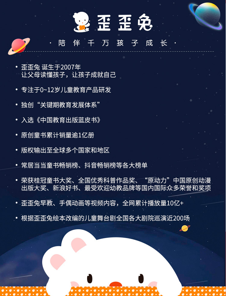 - 歪歪兔,诞生于2007年,专注0-12岁儿童教育产品研发。原创童书销量逾1亿册,音视频播放总量10亿+。