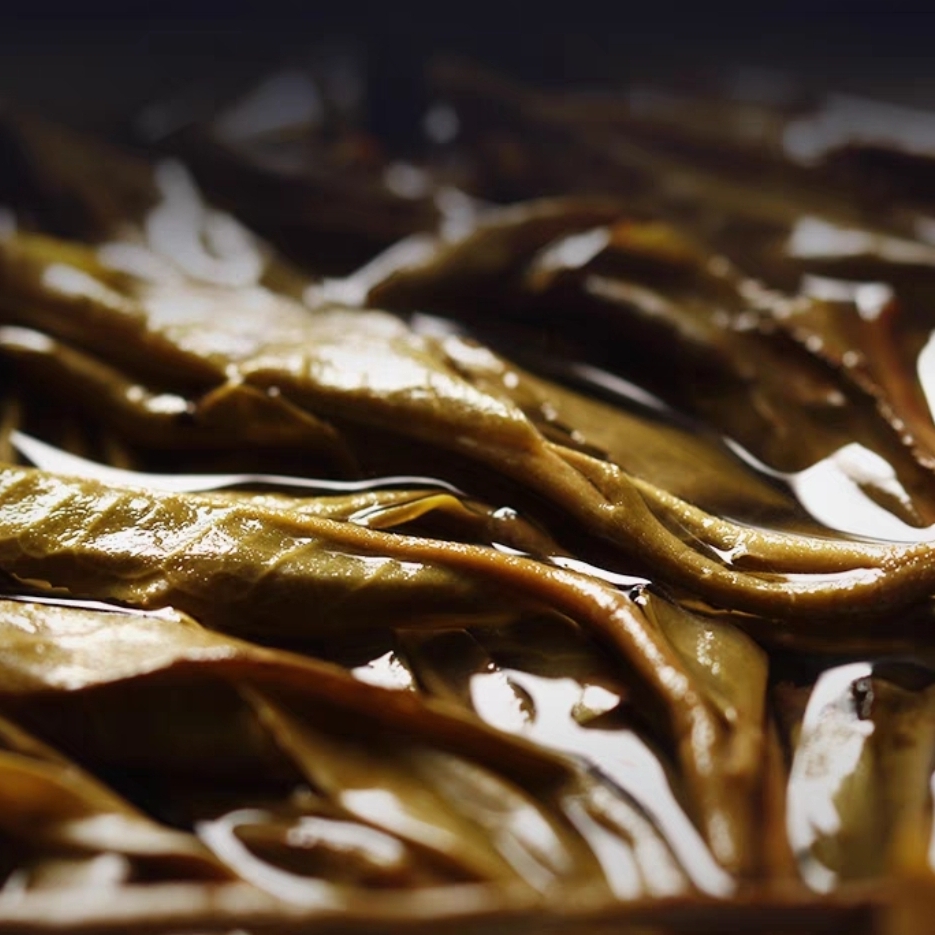 茶汤中能感受到苦味和涩味,苦强于涩,数秒化,回甘迅速,口腔甜香润泽;
