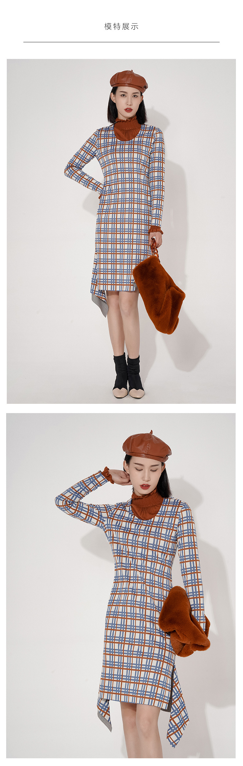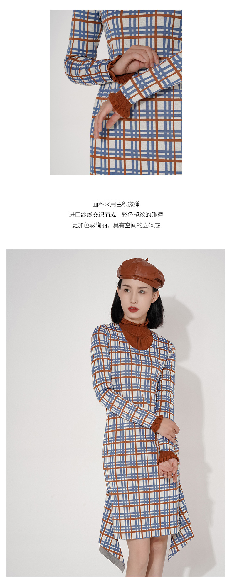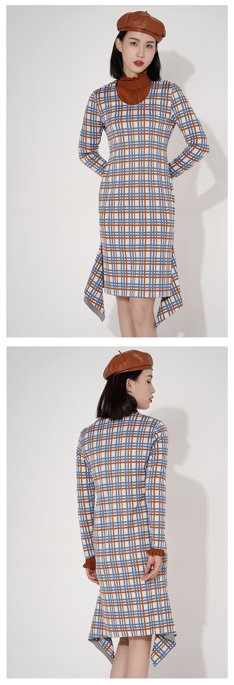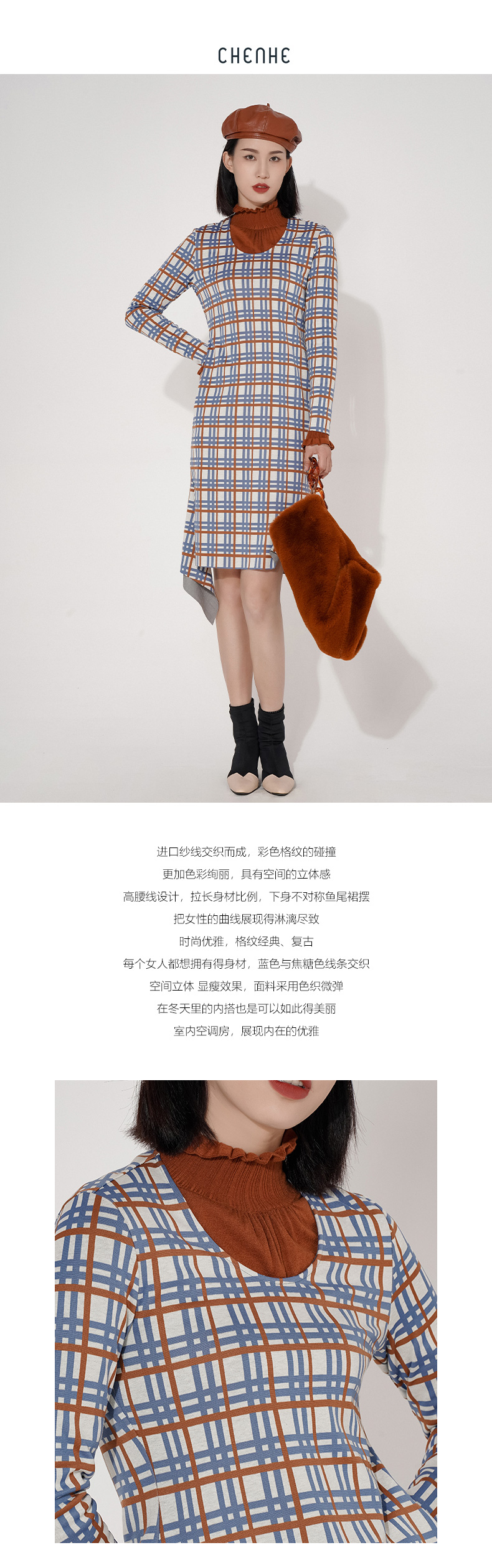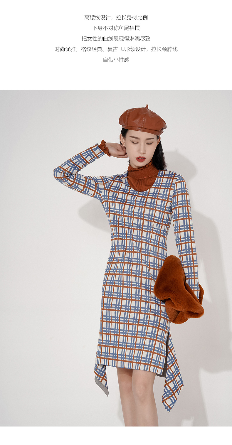 臣禾圆领彩色格纹不对称鱼尾裙摆连衣裙9203020377