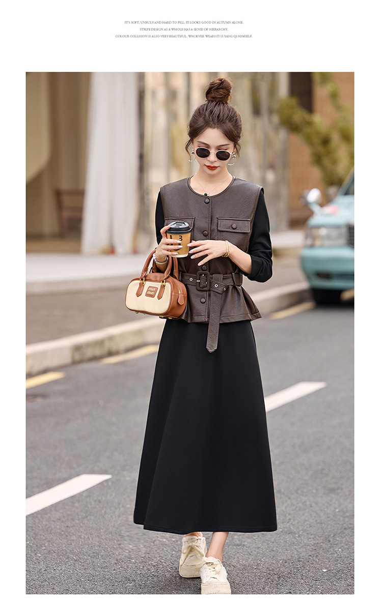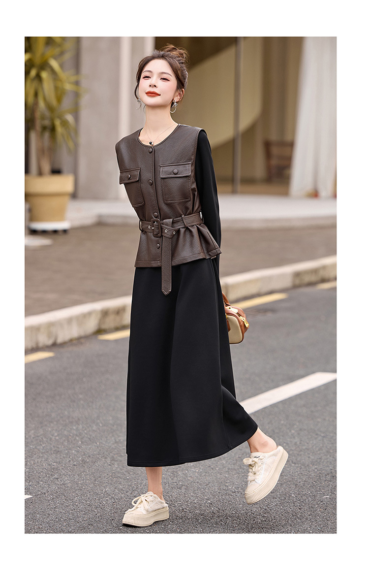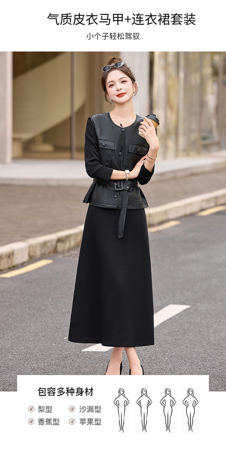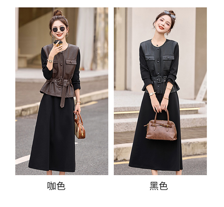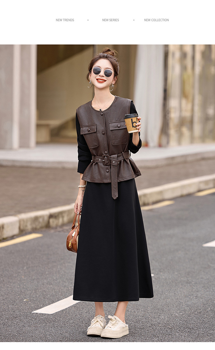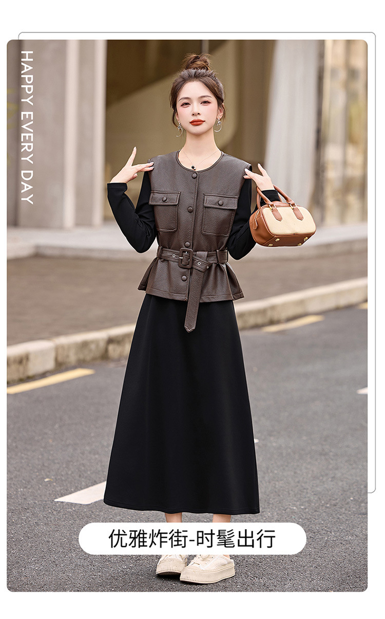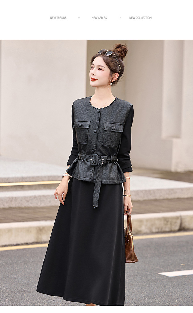 HR YBX8606轻熟风连衣裙套装时尚洋气系带PU皮马甲打底裙两件套