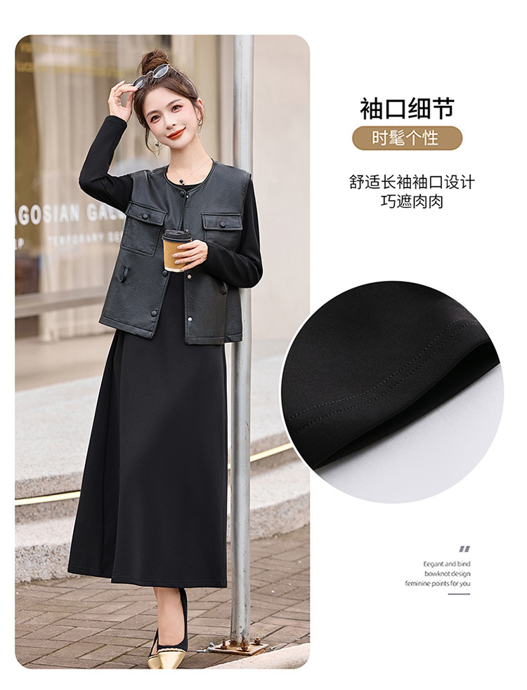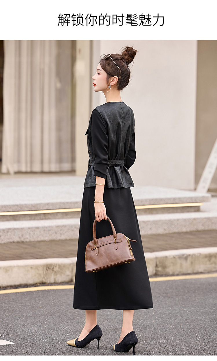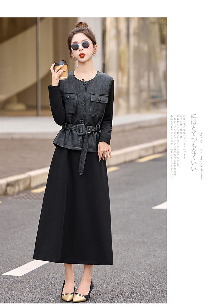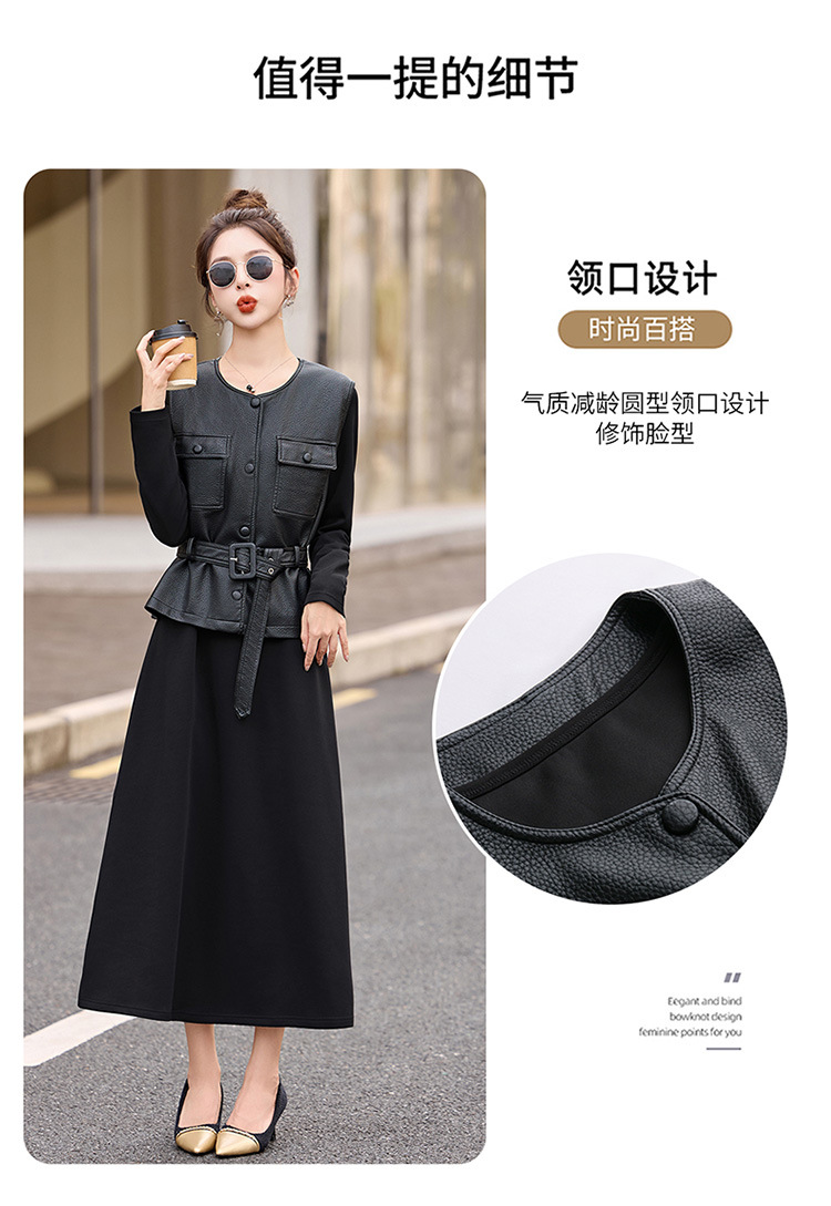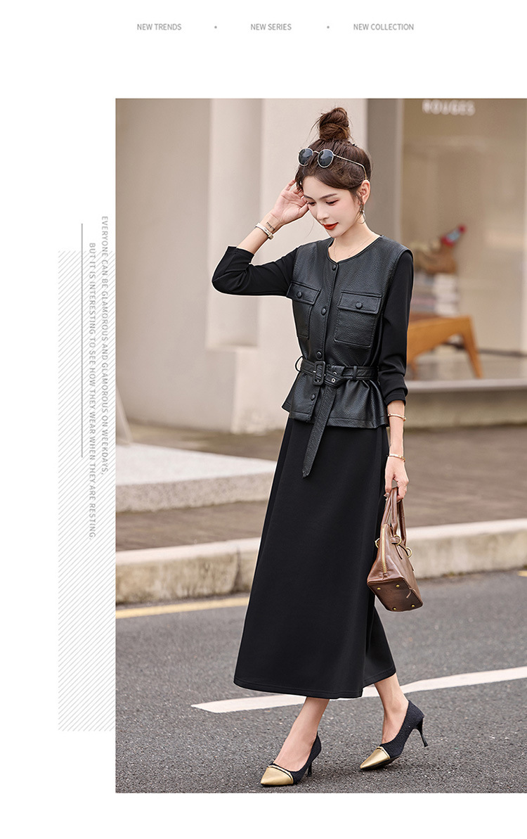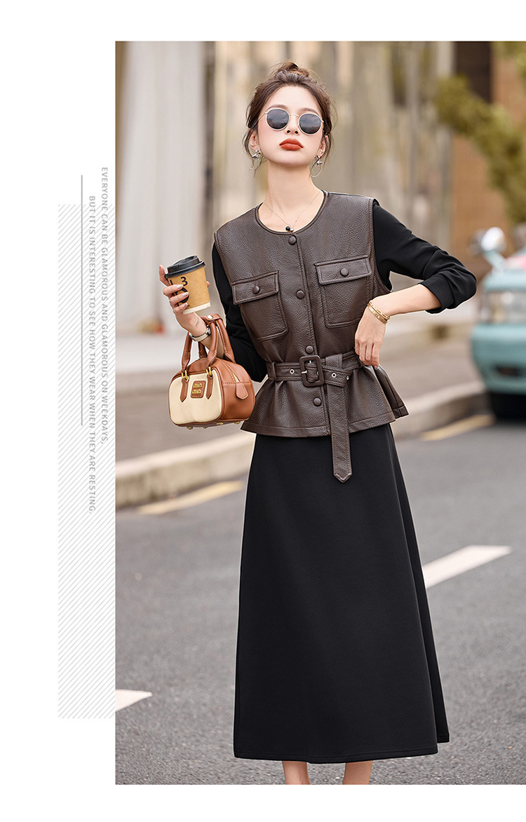 HR YBX8606轻熟风连衣裙套装时尚洋气系带PU皮马甲打底裙两件套