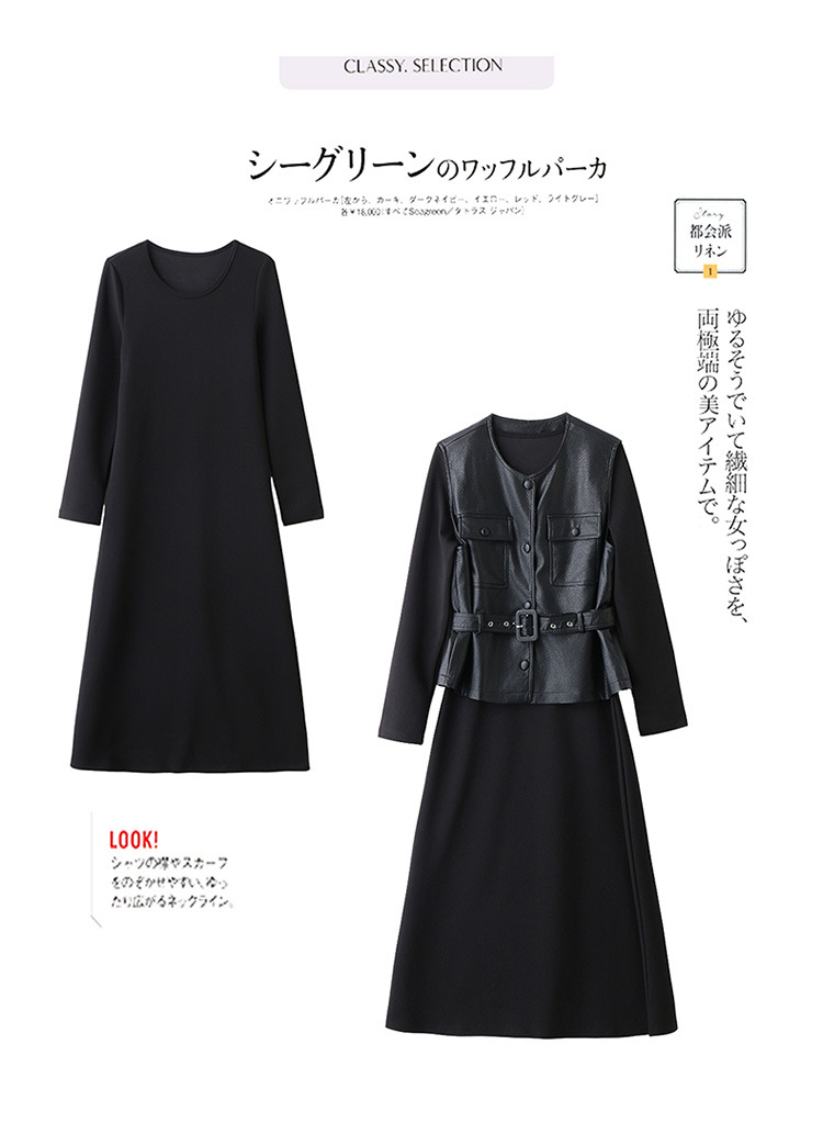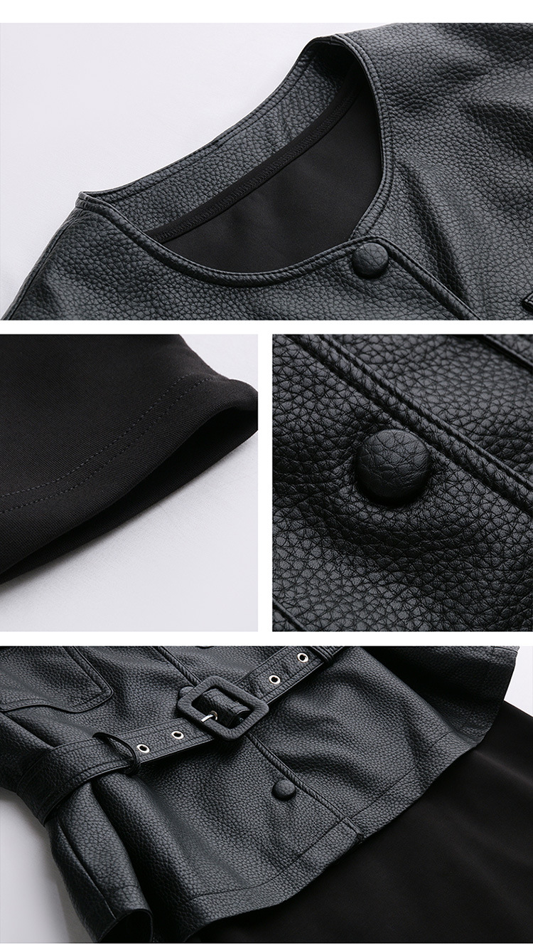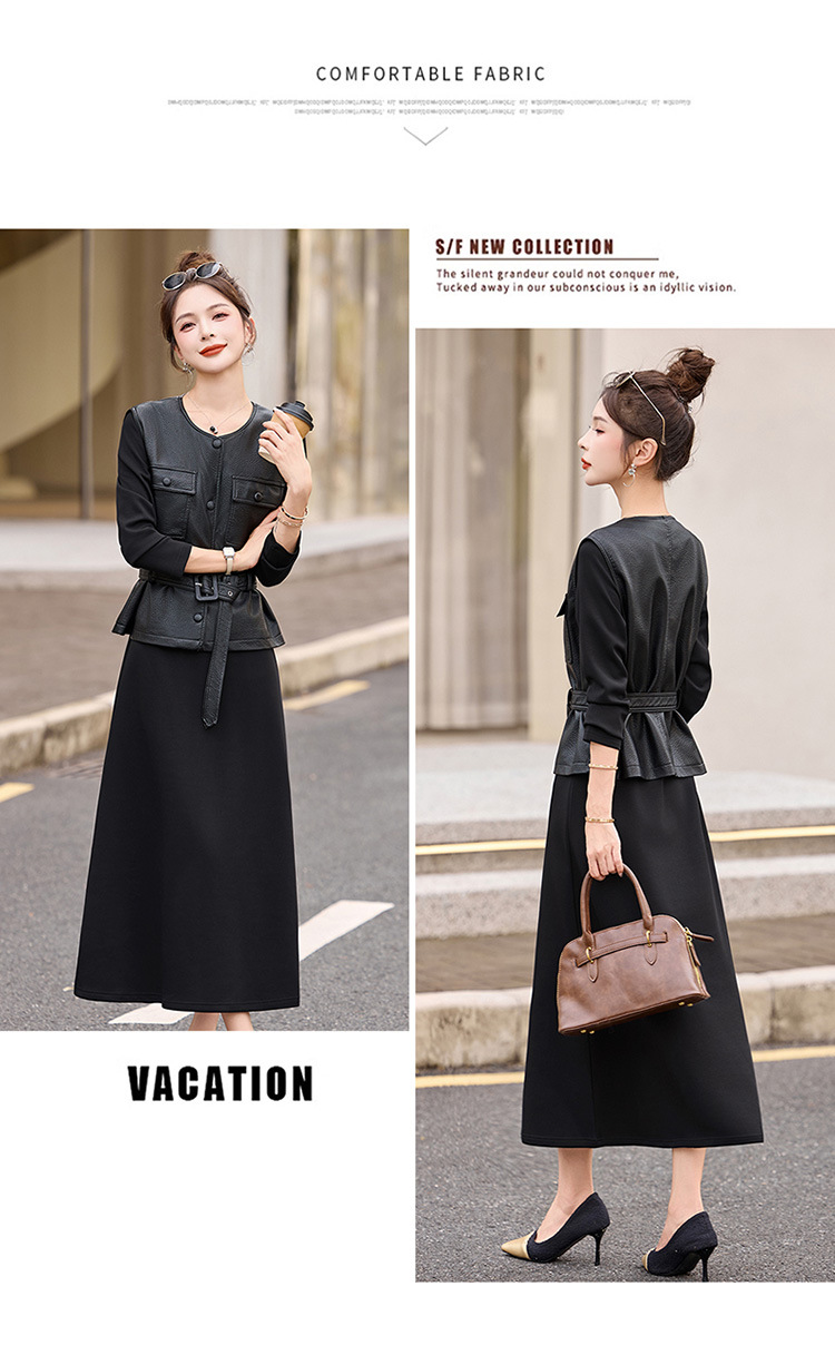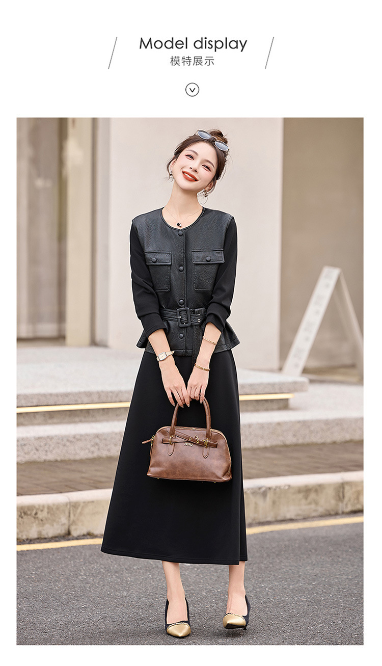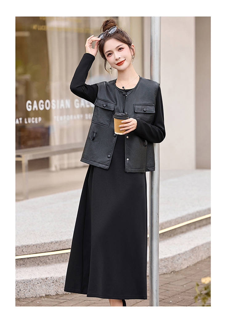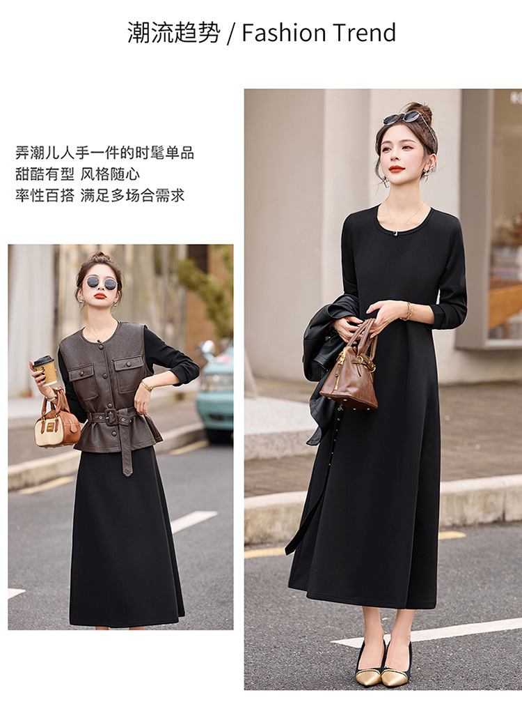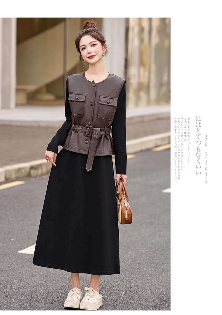 HR YBX8606轻熟风连衣裙套装时尚洋气系带PU皮马甲打底裙两件套