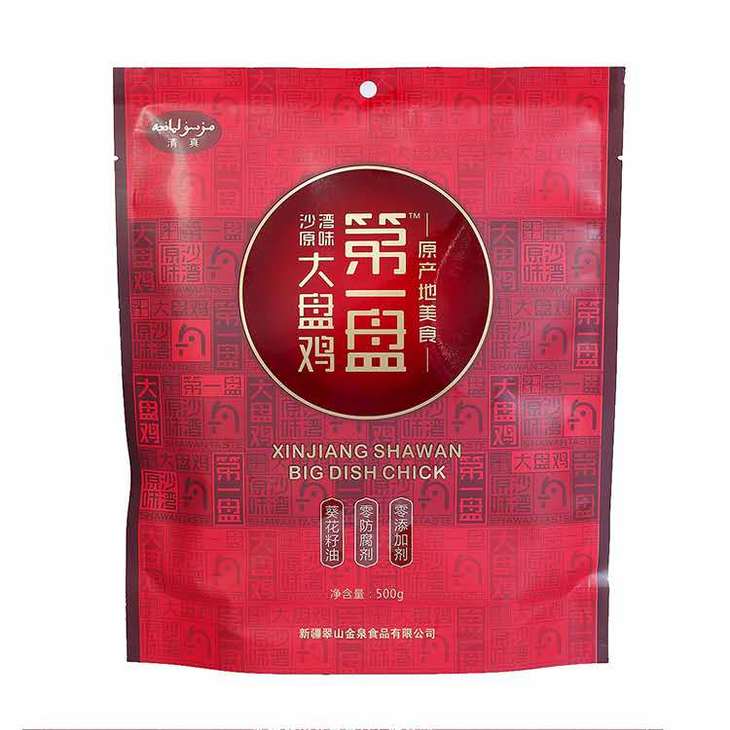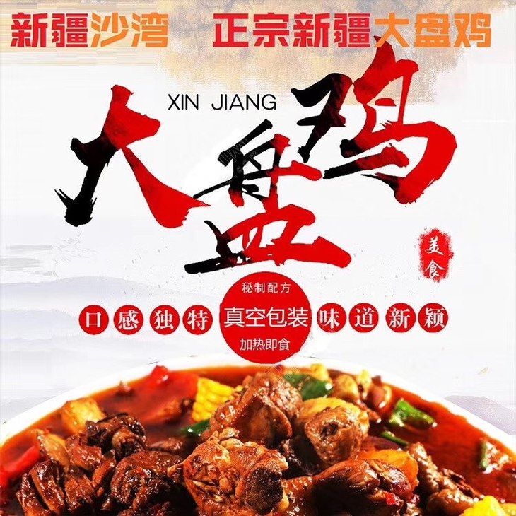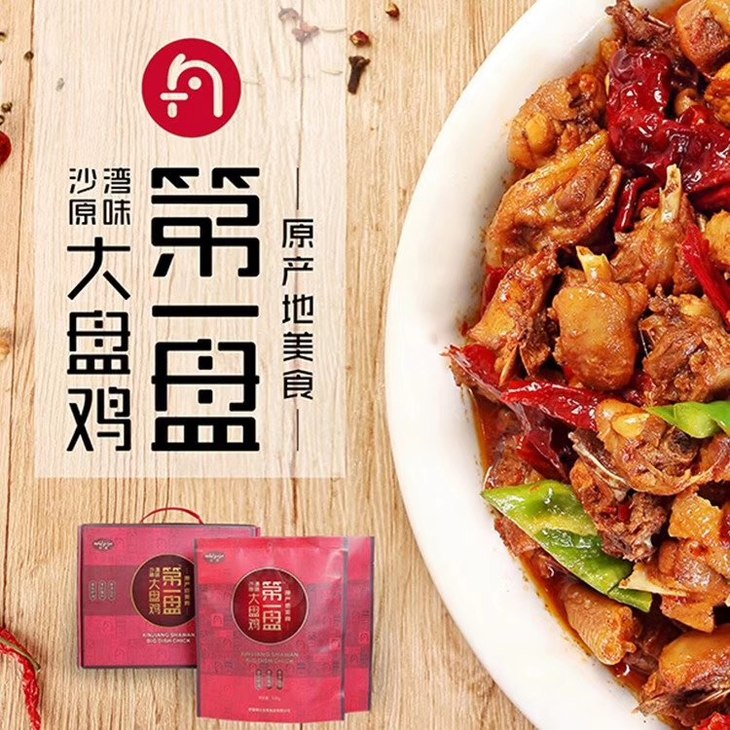 【商品特点】大盘鸡是多种蔬菜与鸡肉搭配烹制而成。鸡要选生长一年的农家土鸡,配上独具地方特色的土豆和安集海镇的大葱、红辣椒,以及花椒粒、胡椒、生姜片、青椒、蒜等配制而成的秘制调料
