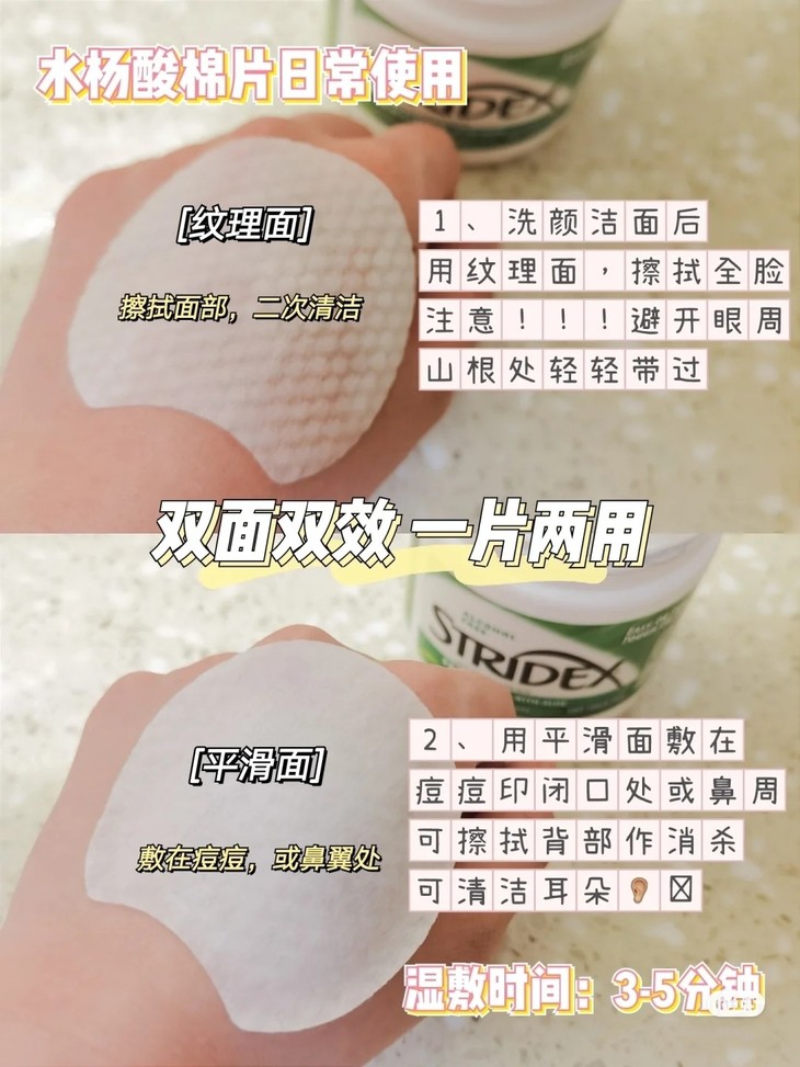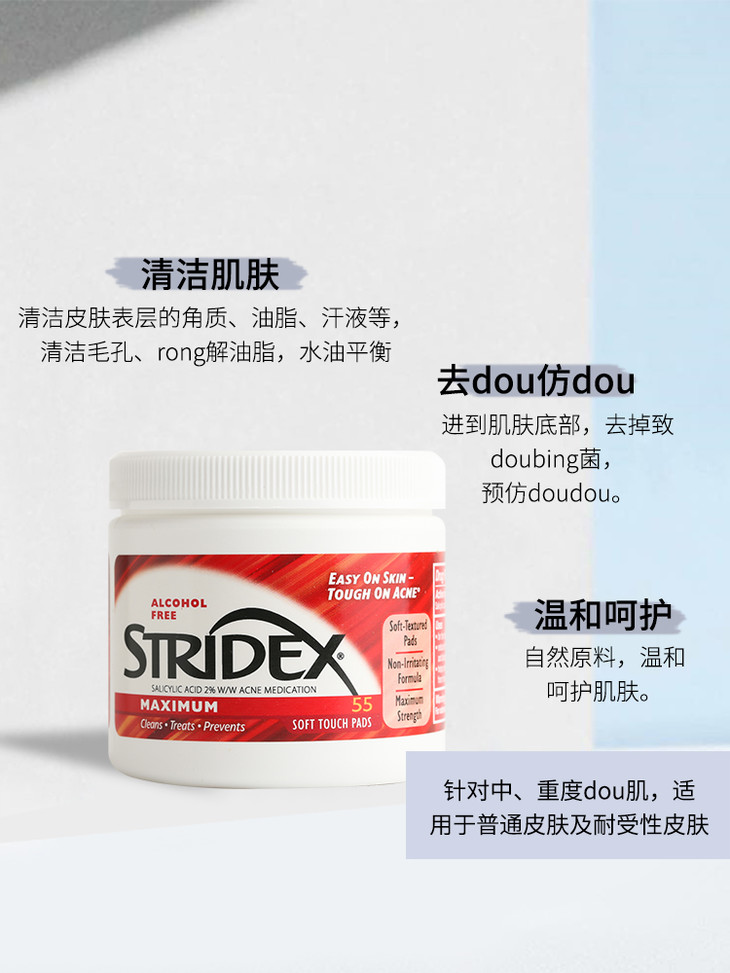Stridex水杨酸洁面片55片👍水杨酸能有效去除表层多余角质,溶解油脂,清洁彻底🍃,毛孔被疏通会更加清爽。天然成分比较温和,湿敷痘痘不建议太久哦😚。0.5%水杨酸 温和型➡️针对初次使用或脆弱肌肤,适用于中性和干性肌肤☺️。2%水杨酸 加强型➡️针对耐受人群,适用于中度痘肌和油性皮肤。