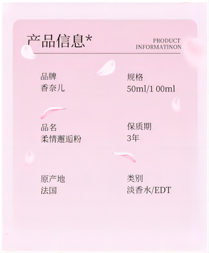 【商品名称】:CHANEL香奈儿粉邂逅柔情淡香水 【商品规格】:50ml/100ml。 【包装方式】:盒装。 【发货时效】:正常72小时内。 【发货地区】:广东。 【配送快递】:四通一达。 【运费说明】:包邮,非偏远地区除外。 【注意事项】:避免阳光直射,存放阴凉处。 |