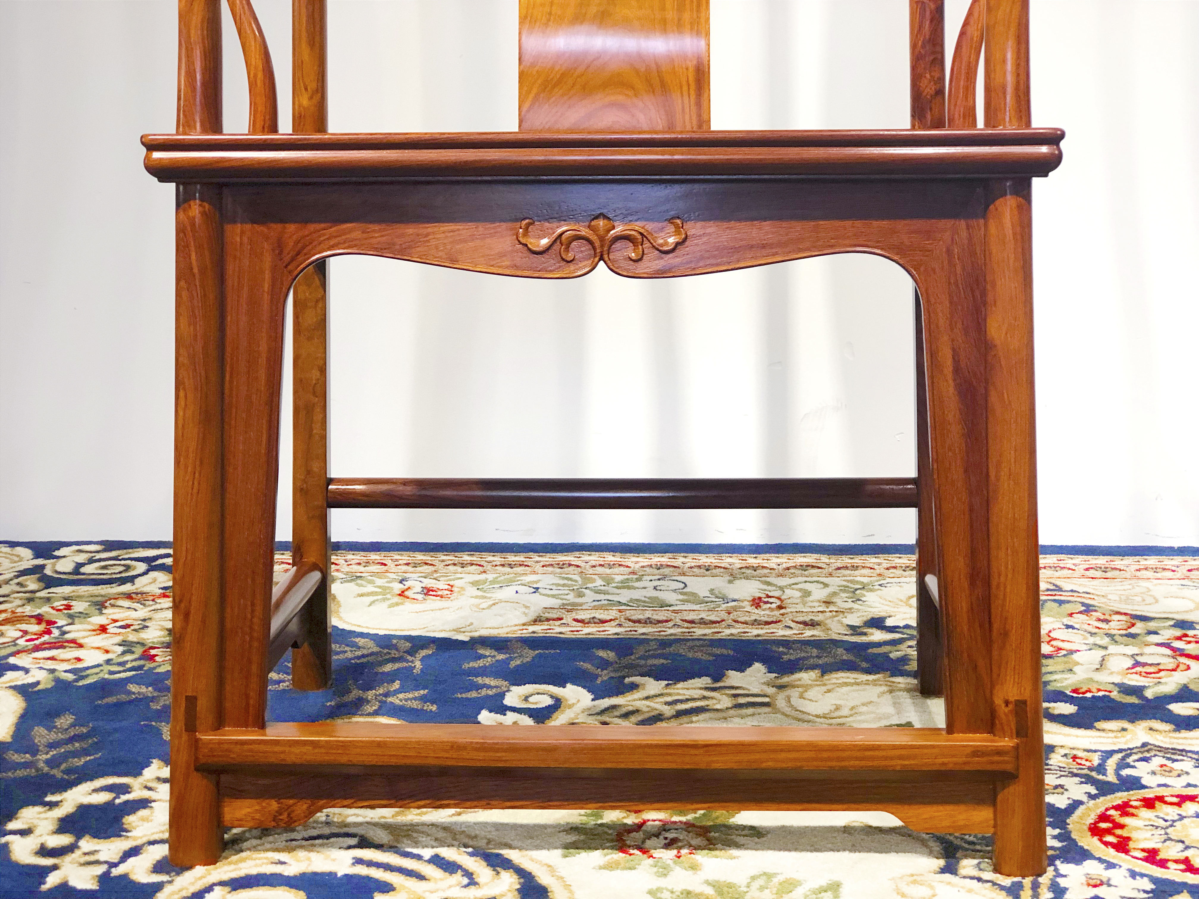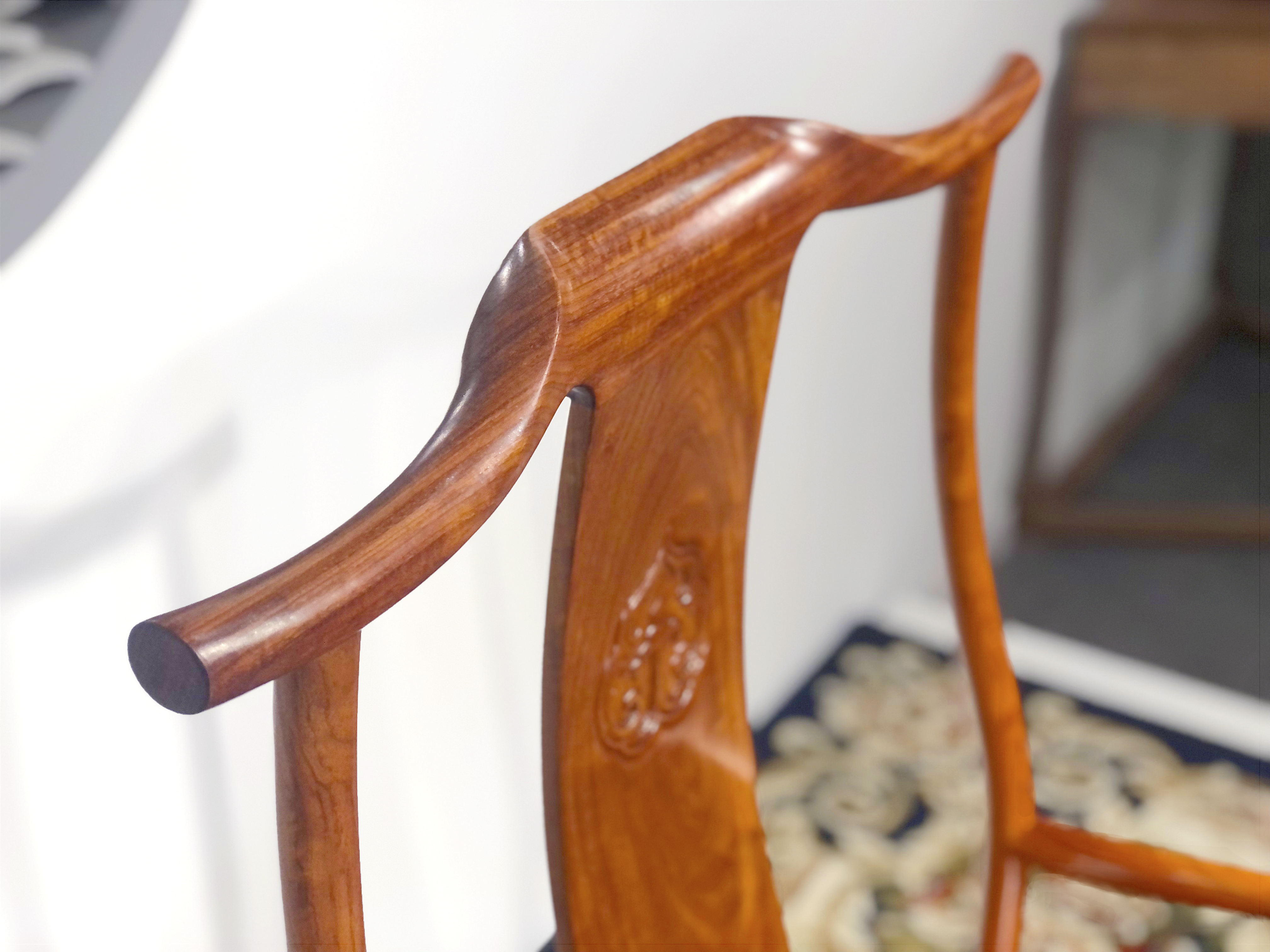 此款四出头官帽椅,极少装饰,在靠板浮雕花纹一朵,由朵云双螭围合而成,另一处细微雕饰在壶门式卷口牙子上浅雕一卷草纹,搭脑的处理,委婉柔和,不露线角,却体面分明,四出头的处理,干净利索,尽显其刚柔相济,另外在设计时采用“S”形靠背板以整板制成,线条弧度与人体脊柱弯度相符,比例匀称,造型流畅,不仅外观简明大方,使用时也极其舒适,典型明式家具,造型简练,却法度严谨,比例适度。