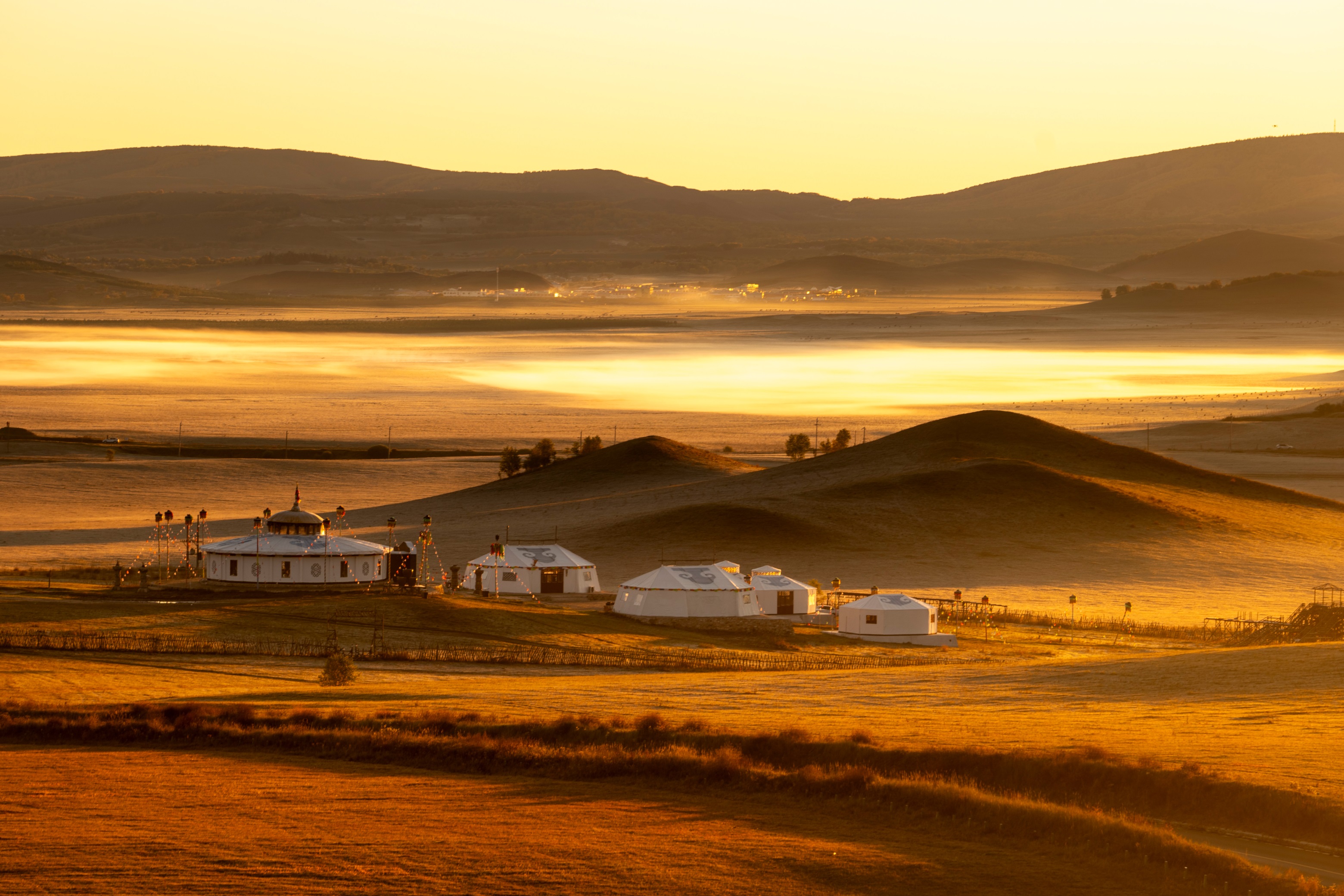 早晨:敖包吐南山拍日出、晨雾、草原牧村风光;