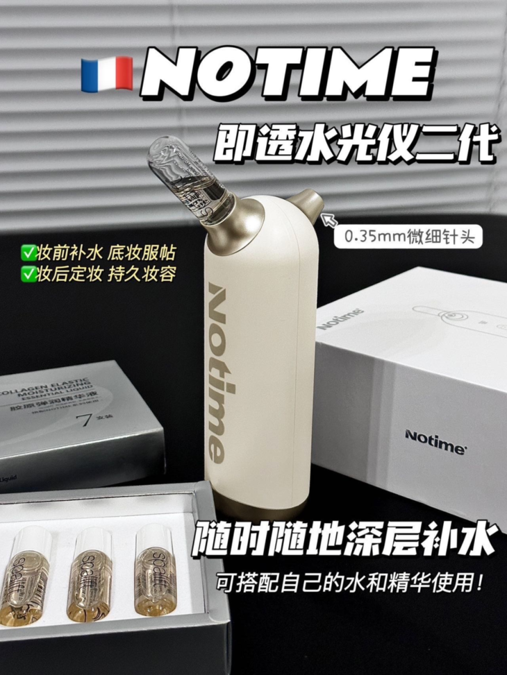 解决皮肤干燥、起皮、补不进水的烦恼,促进营养吸收、长效锁水、肌肤随时水嫩。姐妹们有没有这种感觉,勤勤恳恳敷面膜,做护理,脸还是很干。大部分营养分子都只是在角质层外或者留在手上了,日常简单的涂抹式护肤已经不能满足小仙女们的要求了。这时候该上科技了!Notime即透水光仪Pro,名副其实的护肤功效“放大镜”!1、160KPa高压瞬透⏬精华快速穿透屏障,直达肌底2、1.3倍强劲动力🌫堵?不存在!10秒完成一次快速SPA!3、定制化喷口,瞬间把精华分子碎化成细小分子,吸收加倍!爽肤水、纯露、收敛水、次抛、酵母水、糙米水、紫苏水、精粹水、果酸水、神仙水、樱花水、极光水、官配精华液。