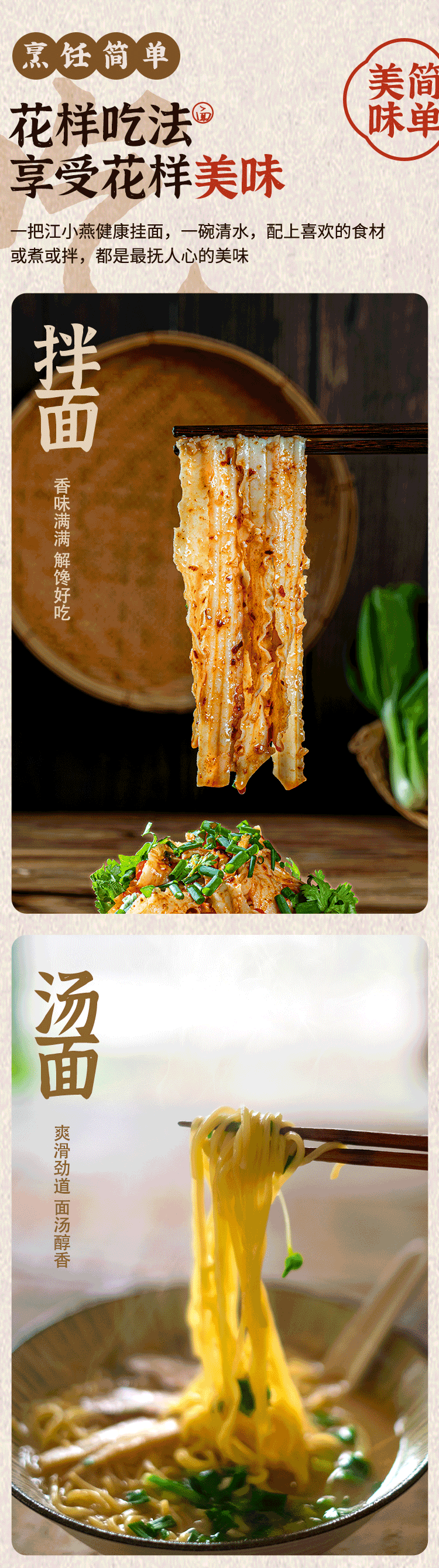 安排!江小燕挂面有细面和刀削面两种面型,可以根据自己的口味进行各种美食diy!拌面、汤面、焖面、炒面......想简单想复杂,想清淡想重口,想主食想辅食都随心!