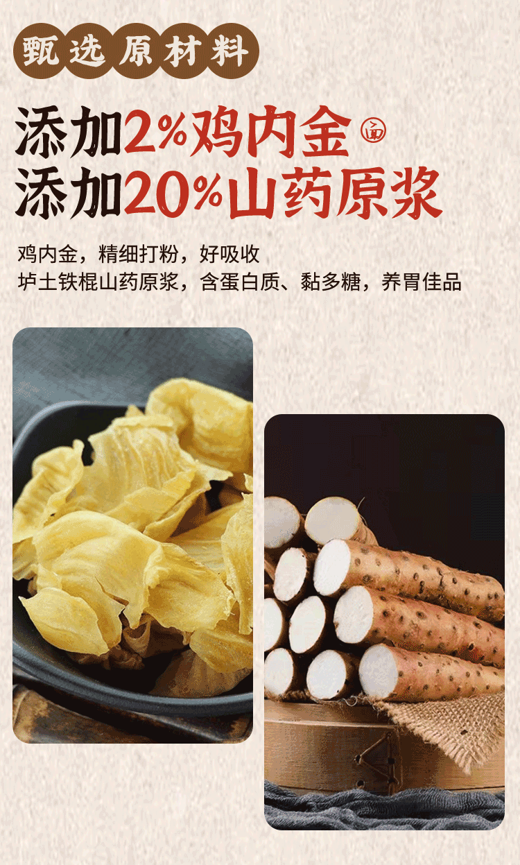 健脾养胃:添加2%鸡内金、20%垆土铁棍山药,好脾胃吃出来。