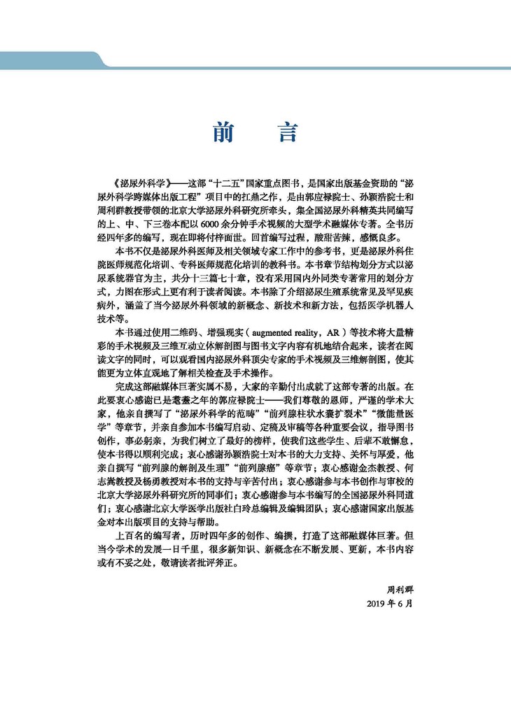 本书通过使用二维码、增强现实( augmented reality,AR)等技术将大量精彩的手术视频及三维互动立体解剖图与图书文字内容有机地结合起来,读者在阅读文字的同时,可以观看国内泌尿外科顶尖专家的手术视频及三维解剖图,使其能更为立体直观地了解相关检查及手术操作。完成这部融媒体巨著实属不易,大家的辛勤付出成就了这部专著的出版。在此要衷心感谢已是耄耋之年的郭应禄院士——我们尊敬的恩师,严谨的学术大家,他亲自撰写了“泌尿外科学的范畴”“前列腺柱状水囊扩裂术”“微能量医学”等章节,并亲自参加本书编写启动、定稿及审稿等各种重要会议,指导图书创作,事必躬亲,为我们树立了最好的榜样,使我们这些学生、后辈不敢懈怠,使本书得以顺利完成;衷心感谢孙颖浩院士对本书的大力支持、关怀与厚爱,他亲自撰写“前列腺的解剖及生理”“前列腺癌”等章节;衷心感谢金杰教授、何志嵩教授及杨勇教授对本书的支持与辛苦付出;衷心感谢参与本书创作与审校的北京大学泌尿外科研究所的同事们;衷心感谢参与本书编写的全国泌尿外科同道们;衷心感谢北京大学医学出版社白玲总编辑及编辑团队;衷心感谢国家出版基金对本出版项目的支持与帮助。
