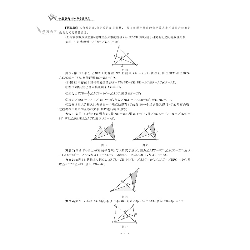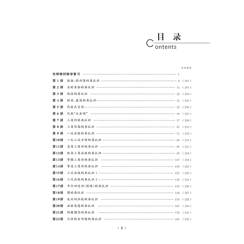 如何在复习的过程中站在一个更高的层面去提升效果?如何让学生将所学知识融会贯通?如何提升综合解题能力?如何在复习的过程中做到有针对性?如何做到高效?基于以上想法,作者结合连续多年带初三毕业班的经验,整理一本供初三复习使用的“再认识”讲义,在每一讲里面,针对某一具体的重点或难点内容,将与它有关的内容、方法等综合梳理出来,精讲十道典型例题及精练十道变式练习,达到对初中重难点内容突破这一目的。