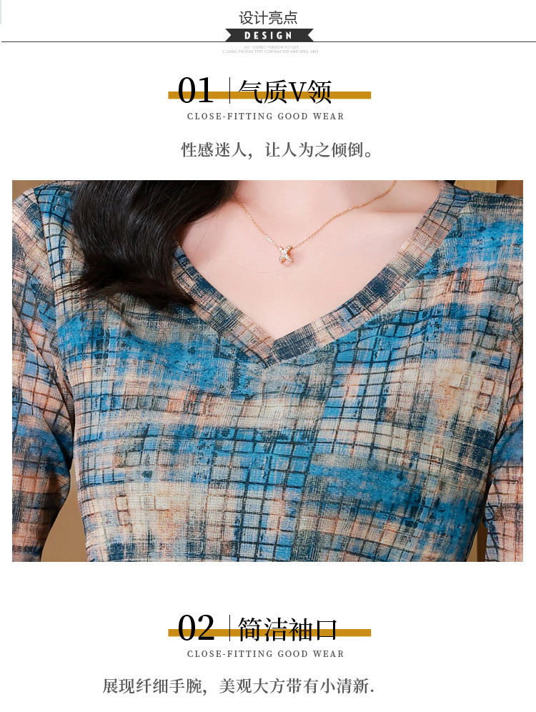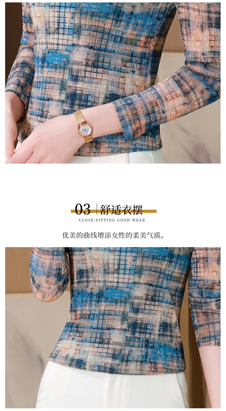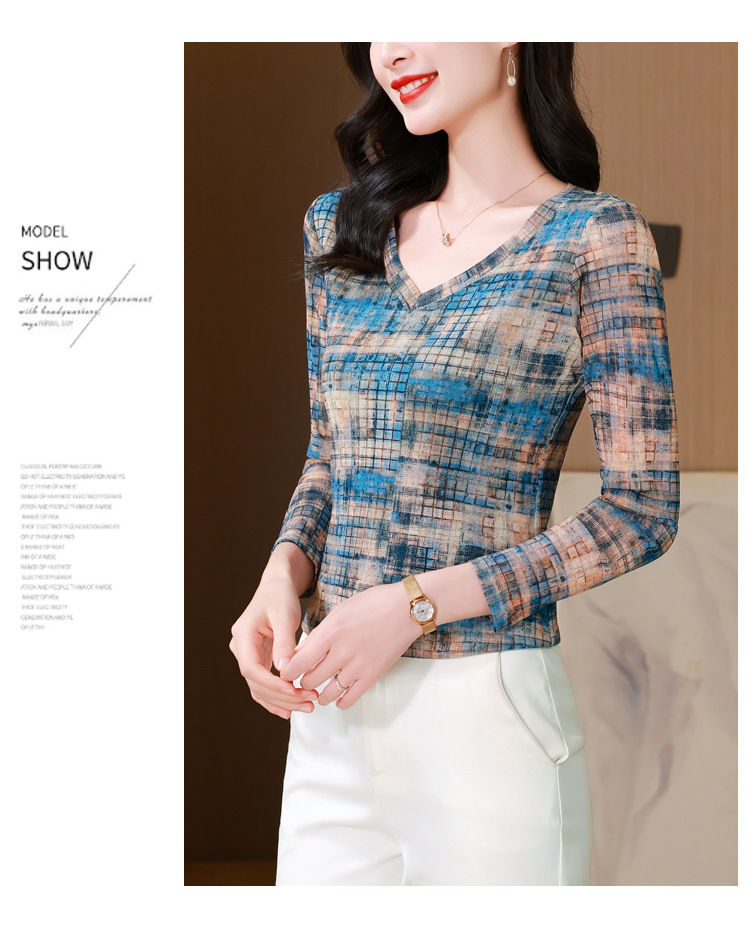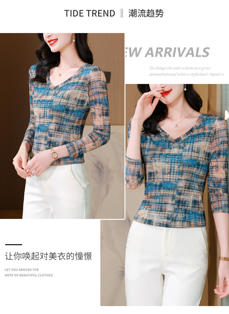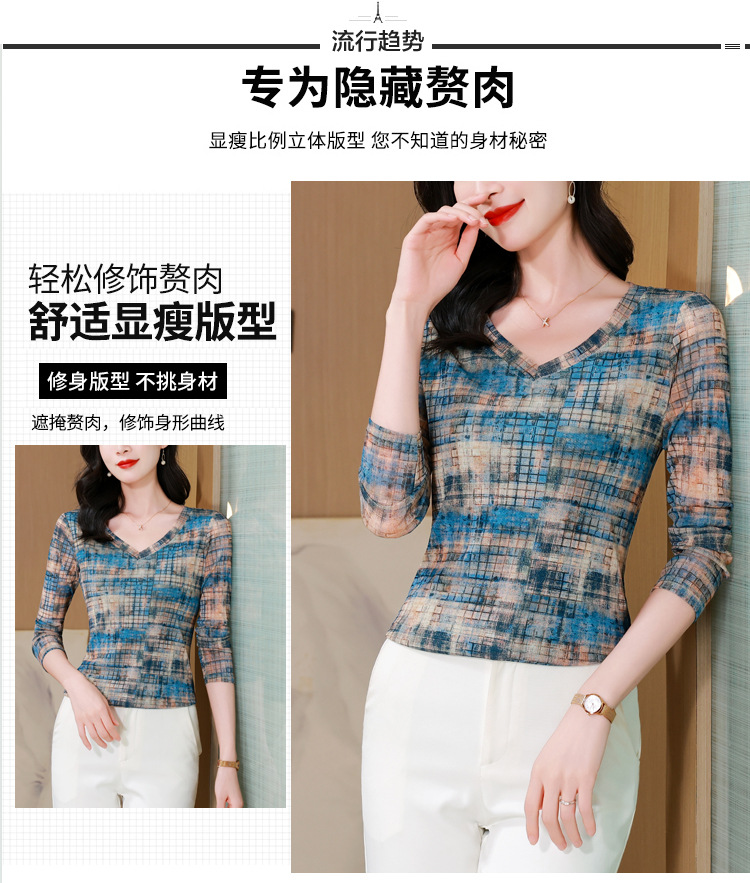 KQL 806c5a7时尚纱网印花长袖V领修身显瘦洋气上衣