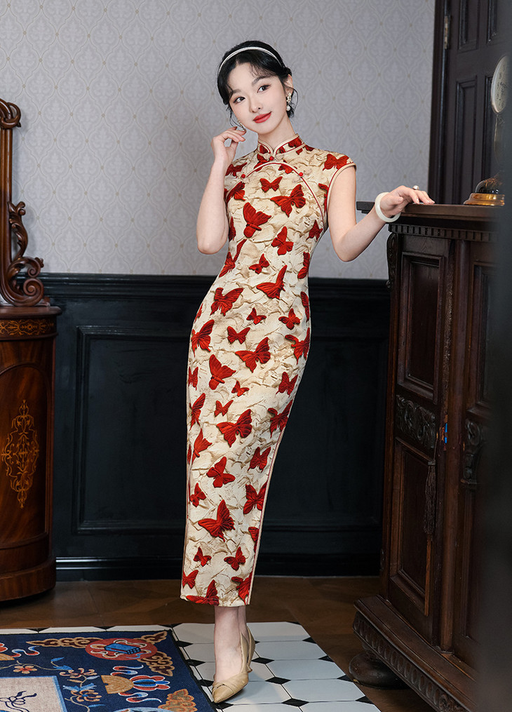 2025年春夏款新款老上海复古无袖长款国风蝴蝶立体印花旗袍XL1205