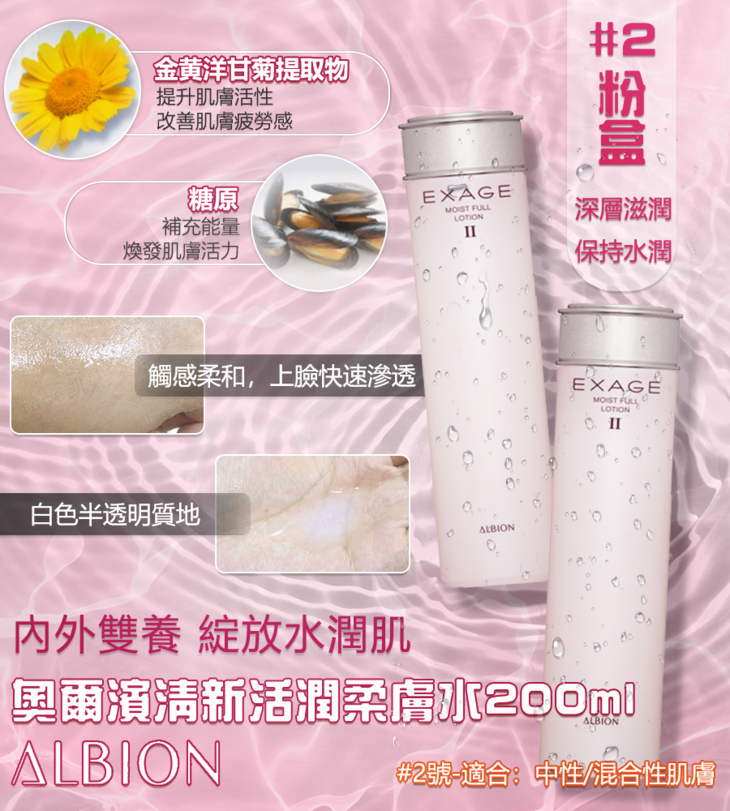 👑奥尔滨清新活润柔肤水200ml #2 粉盒 👍#2号-适合:中性/混合皮 🔆主打:深层滋润、保持水润 🍒有效:提升角质层补水能力、保湿补水的同时,形成保护膜,持久保持肌肤水润 🌼白色半透明质地,触感柔和,但上脸快速渗透 ✨适合:肌肤容易干燥、粗糙、锁水保湿力不足的肌肤使用