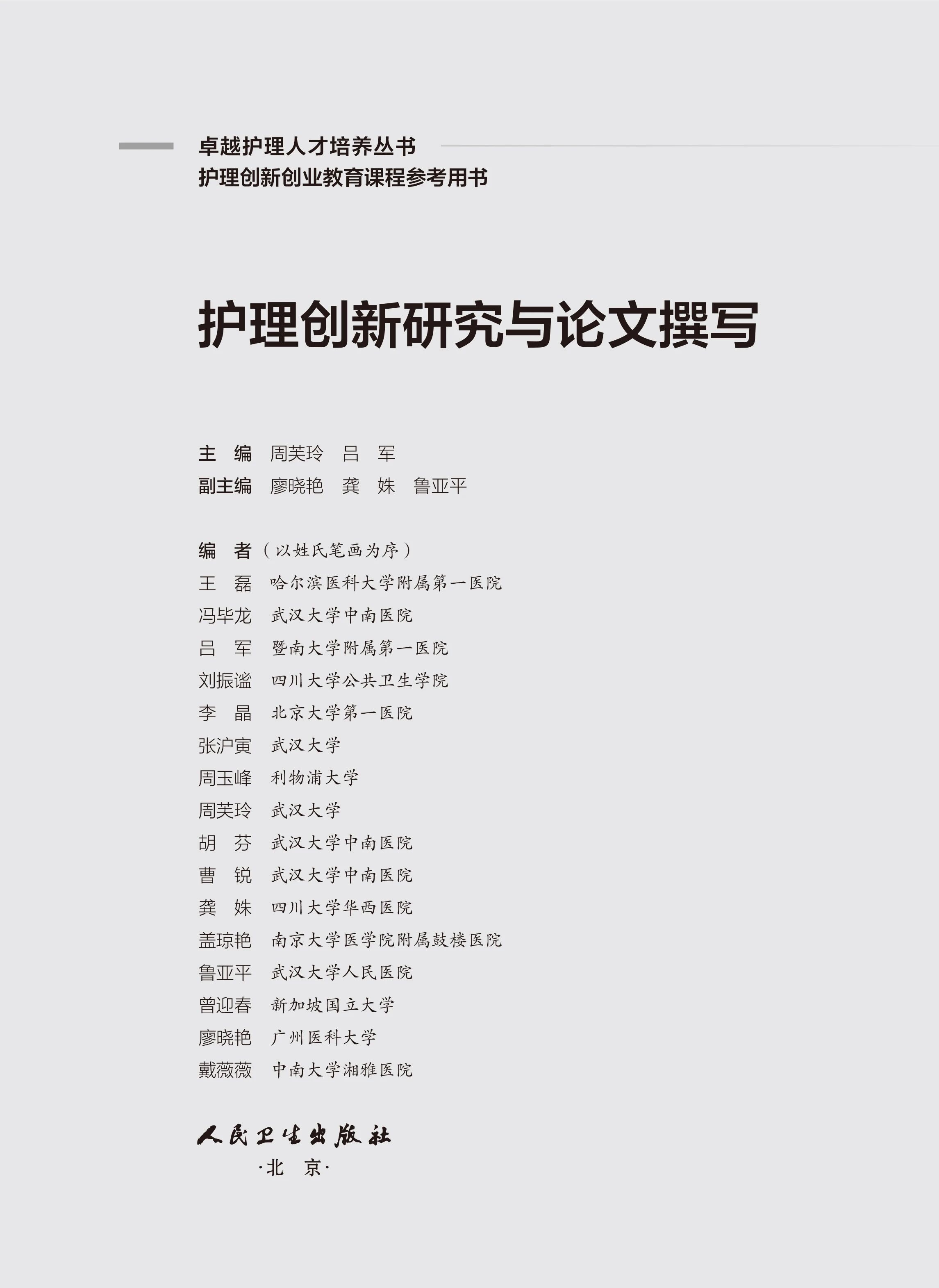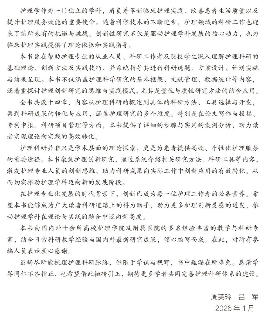 本书聚焦护理科研创新,由国内外十余所高校及医院专家联合编写,涵盖护理科研基础理论、文献管理、数据统计等核心内容,重点讲解量性与质性研究方法的结合,以及论文写作、专利申报、项目管理等实用技能。书中结合最新研究成果与真实案例,精准指导科研全流程,助力读者实现理论向实践的高效转化,是护理专业人员、科研者与学生的权威参考。