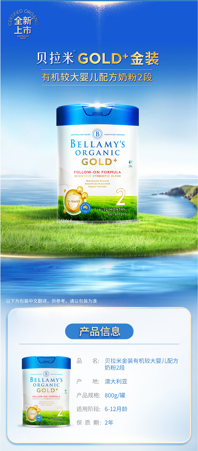 贝拉米(Bellamy)金装版GOLD有机婴儿配方奶粉2段(6-12月) 800克/罐 澳洲进口